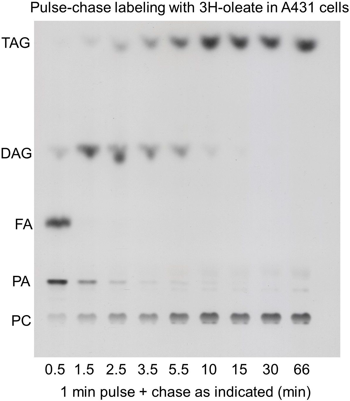 In 2005, being a group leader at the MPI-CBG in Dresden, I planned a lecture on lipids for the institute’s annual PhD-course. I looked for original experimental data that would visualize the flow of fatty acid through the Kennedy pathway, but I failed to find it. So I went to the lab and did a pulse-chase experiment with radiolabeled oleic acid in A431 cells. By TLC separation and X-ray film detection I obtained the picture shown below. It nicely shows the flow of the labeled fatty acid, it has a good signal-to-noise ratio and a very good time resolution, but it lacks lipid species resolution, it is limited to the major lipid classes and is at best semi-quantitative. Experts also see the overload in the DAG and TAG spots since a million cells was necessary to obtain enough signal.