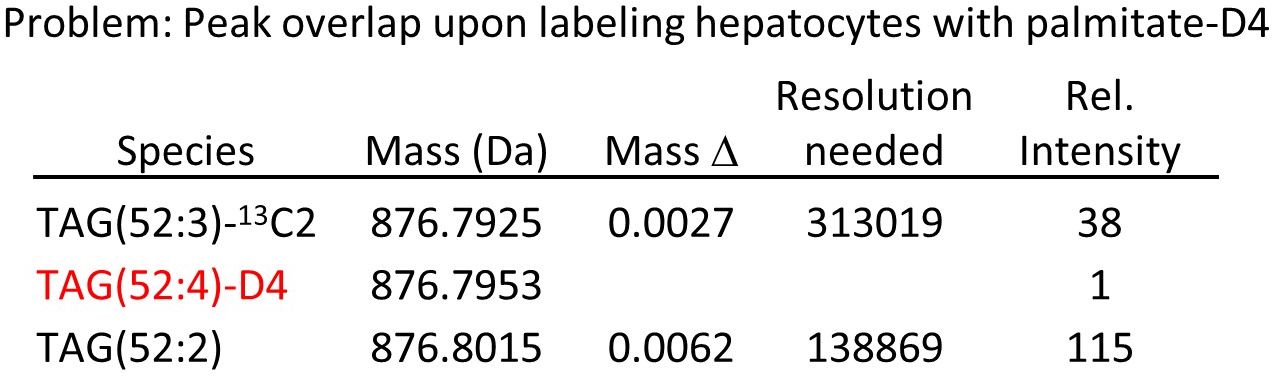 Why not simply use deuterium- or 13C-labeled fatty acids for tracing? The answer lies in the complexity of lipid meatbolism. As seen above, fatty acid metabolism takes place on the minute scale, so it needs labeling times in the minute range to resolve it kinetically. Still, hundreds of labeled species are produced in these short pulses, most of them in very small amounts. Now imagine you have a palmitic acid with four deuterium atoms as the label. At a very realistic degree of labeling of 1% you obtain the following if you look at one of the major triglycerides: