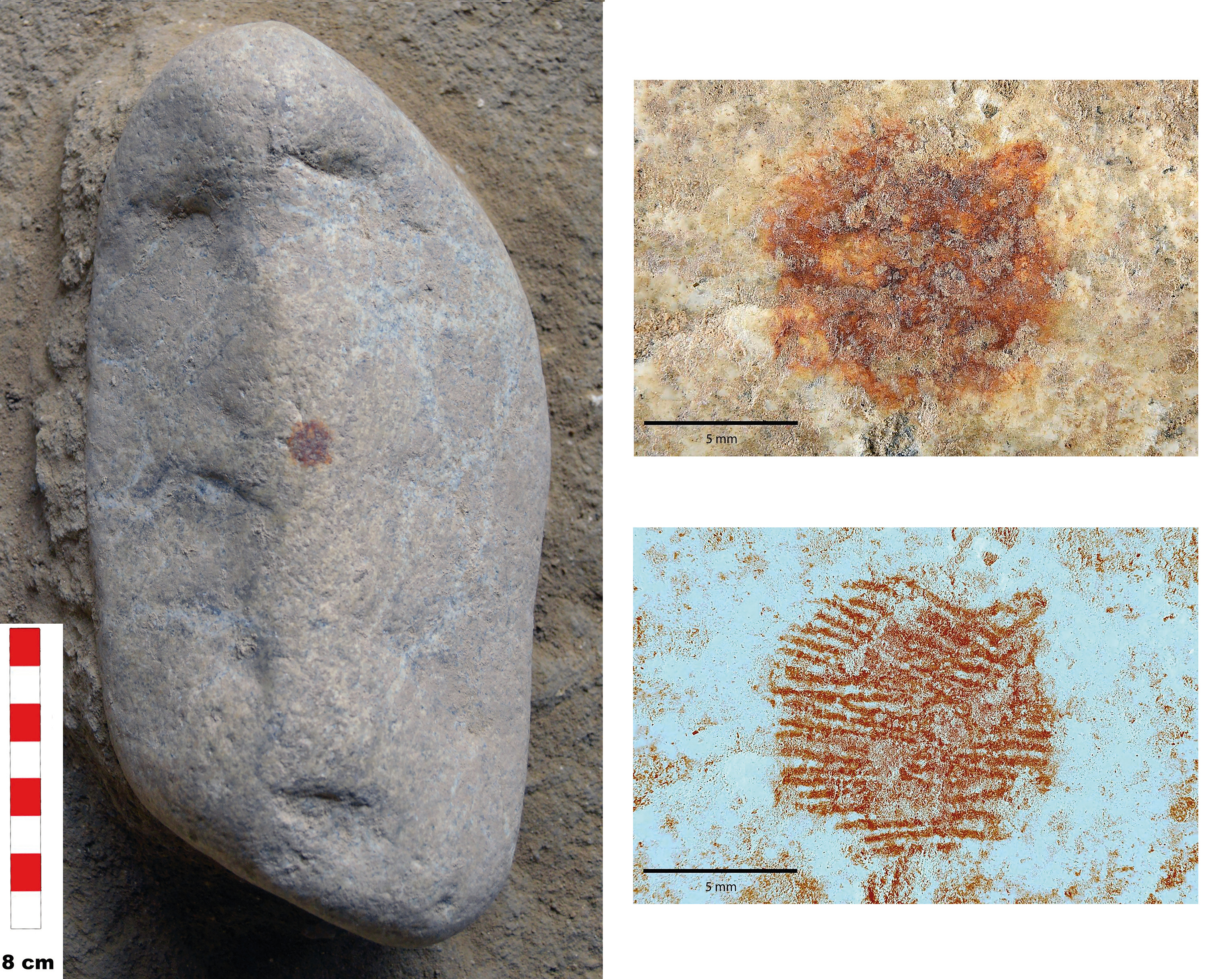 This study presents a remarkable discovery that further expands our understanding of Neanderthal cognitive abilities: a painted piece of portable art, currently regarded as the oldest known example of its kind associated with Neanderthals. The object is a granite pebble onto which a red ochre dot was deliberately applied. Most notably, a fingerprint has been identified within the pigment—unequivocally attributed to a Neanderthal individual—making this find a direct and tangible trace of symbolic behaviour carried out more than 42,000 years ago.