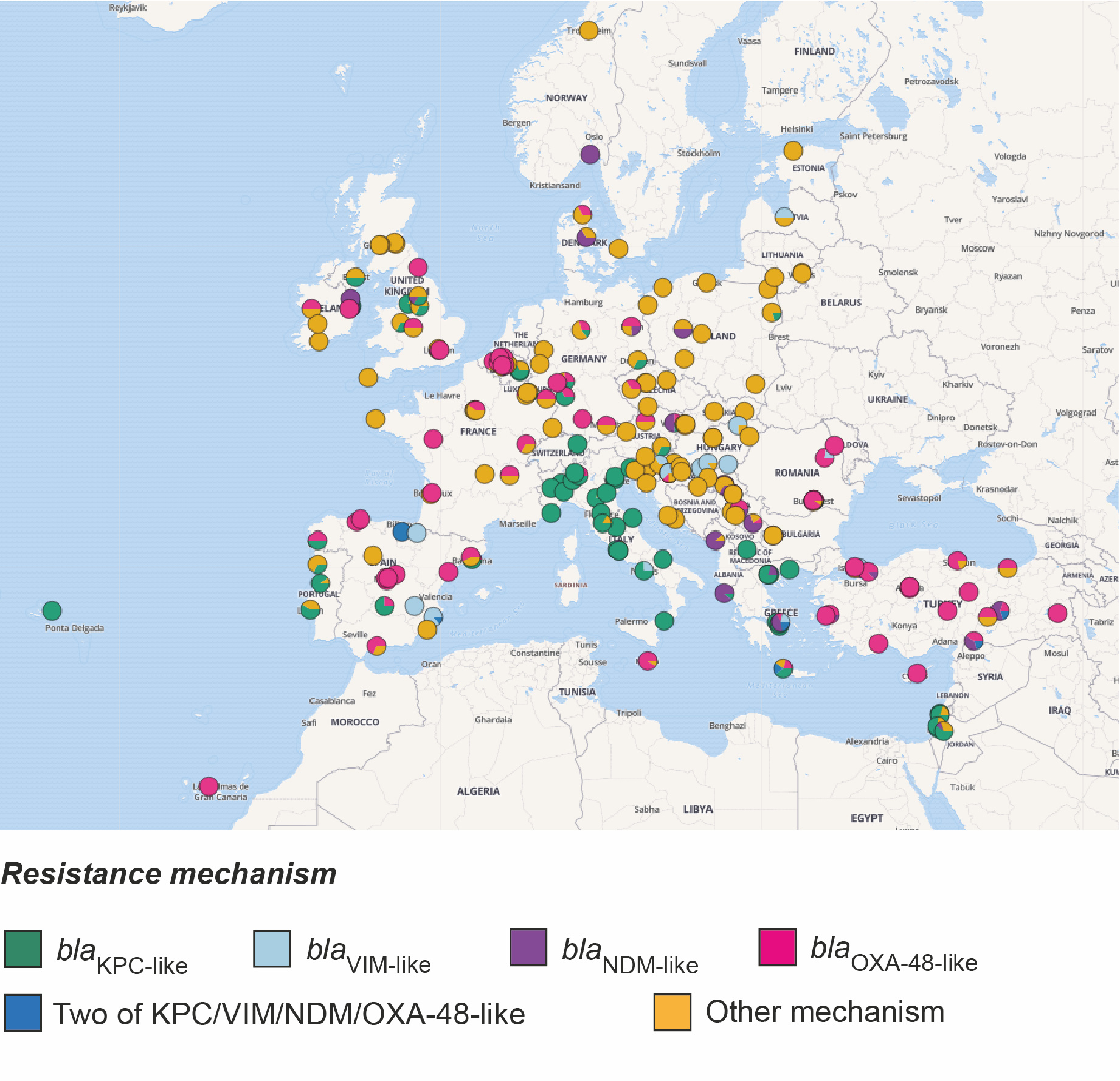 Figure 1. Sampling locations of participating hospitals in the “EuSCAPE” survey from which K. pneumoniae isolates were obtained and sequenced in this study. Each pie chart, representing a sampled hospital, shows the proportion of carbapenem-non-susceptible isolates with different resistance mechanisms.