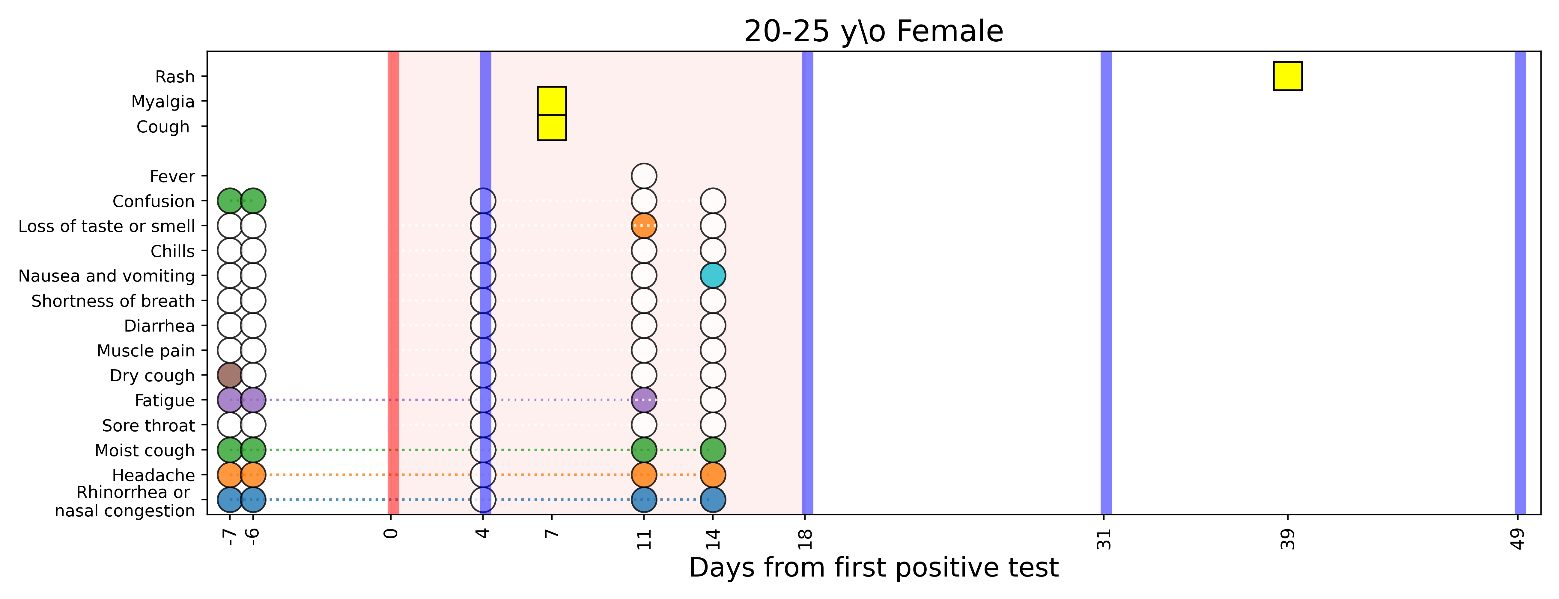 Figure 1 - An example of an individual in our cohort. Symptoms recorded by a physician at a primary care (yellow rectangles) and self-reported symptoms (colored circles) are presented. Red and blue vertical lines represent a positive or negative PCR test for SARS-CoV-2 respectively.