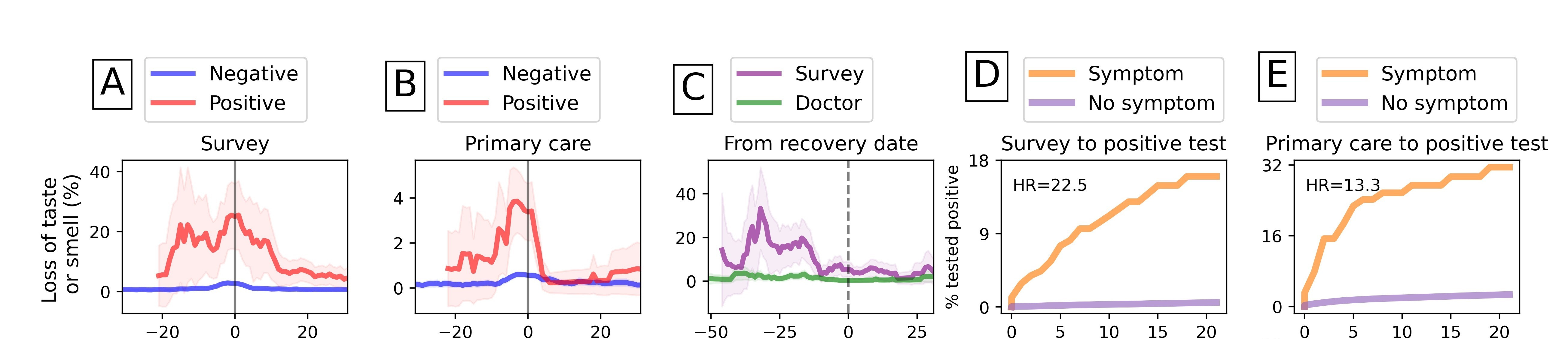 By analysing symptoms longitudinally, we unravel different temporal patterns of self- reported and documented symptoms. Loss of taste and smell 3 weeks prior to testing, either self-reported or EHR-recorded, were the most discriminative symptoms for COVID-19 (Figure 2). Additional discriminative symptoms included self-reported headache and fatigue and a documentation of syncope, rhinorrhea and fever. Symptoms with long duration after recovery included fatigue, myalgia, runny nose and shortness of breath.