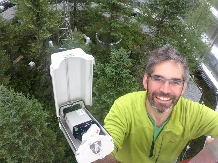 The author installing a PhenoCam at the SPRUCE experiment in Minnesota.