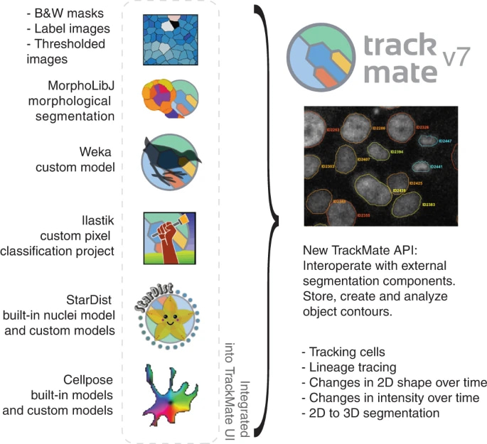 Figure 1: New TrackMate detectors. Popular segmentation tools, such as ilastik, the Weka Trainable-Segmentation Fiji plugin, StarDist, cellpose (Stringer et al., 2020) and the morphological segmentation tool MorphoLibJ have now been incorporated into the new TrackMate. The New TrackMate can now also track previously segmented objects by directly importing mask or label images.