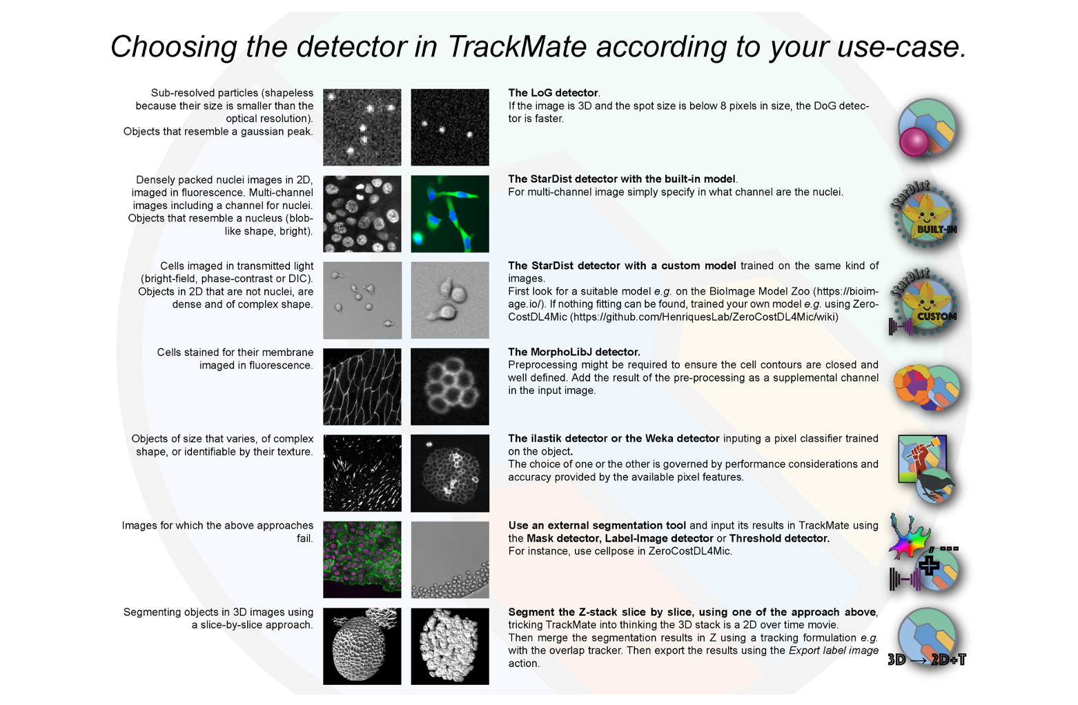 Figure 3. Cheatsheet for choosing the best TrackMate detector for your use case.