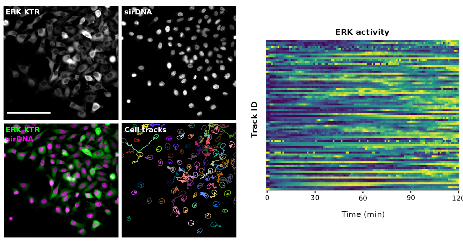 Figure 2: Following ERK activity in migrating cells. MDA-MB-231 cells stably expressing an ERK activity reporter (ERK-KTR-Clover) and labelled using SiR-DNA were recorded live using a wide-field fluorescent microscope for 2 hours (1 image every minute). The “Versatile fluorescent nuclei” StarDist model was used to track the cell nuclei. For each tracked cell, the average intensity of the ERK reporter was measured in their nucleus over time (directly in TrackMate). Changes in ERK activity are displayed as heatmaps (blue low, yellow high). Heatmaps were generated using PlotTwist. Scale bar = 250 μm.