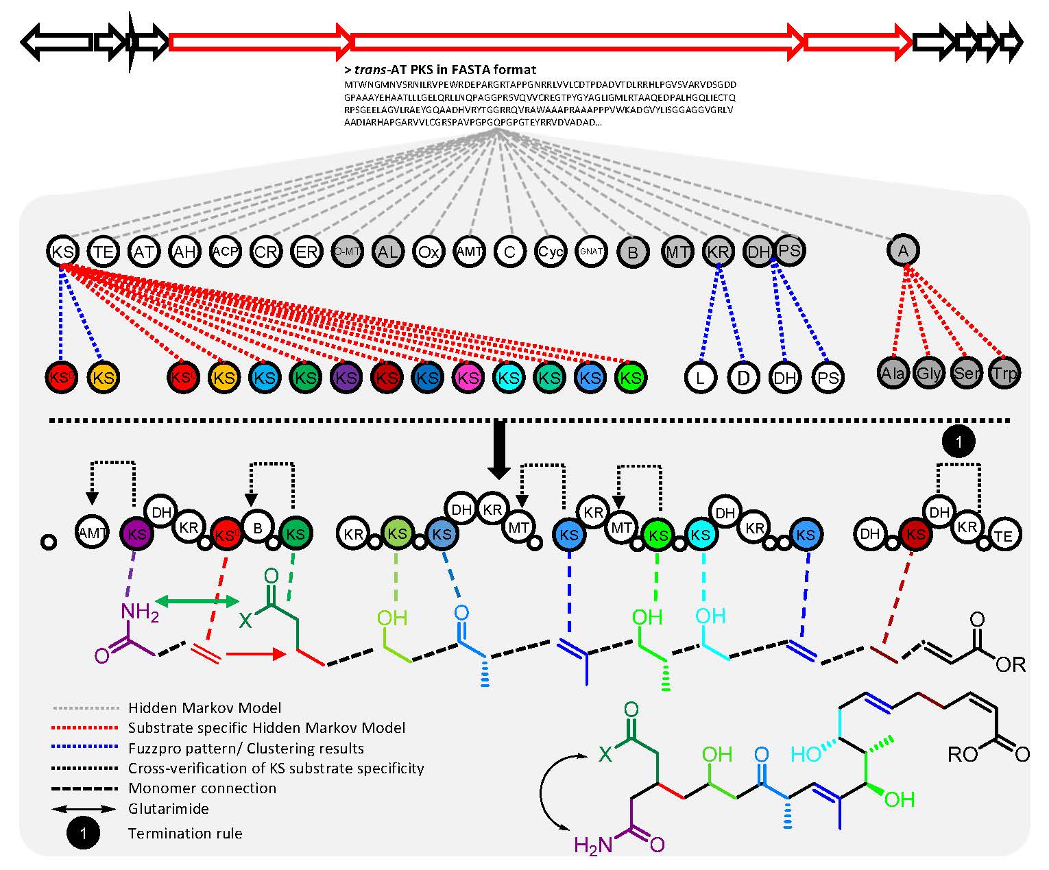 Combining insights into such polyketide structures, biochemical data, and extensive bioinformatic analyses, we have been able to decipher the biosynthetic principles of these unusual assembly lines. A straightforward correlation between the phylogeny of a single enzymatic domain within a module, the ketosynthase domain, and the chemical structure of the incoming substrate is sufficient for precise predictions of polyketide cores. However, these predictions required detailed biosynthetic knowledge, a reference dataset, and the tedious construction of large phylogenetic trees. To make the analysis of polyketide pathways available for broader community, we developed TransATor, a bioinformatic platform that automatically analyzes polyketide pathways and predicts the corresponding polyketide core structures. These predictions enable efficient in silico dereplication and prioritization of bacterial strains, the identification of chemical novelty, and the identification of culturable producers in cases where the original pathway stems from metagenomic studies. In the present study we show how the tool can be used to predict novel structures and to guide the subsequent structure elucidation process. Moreover, we used TransATor to establish biosynthetic models for even highly aberrant polyketide structures.