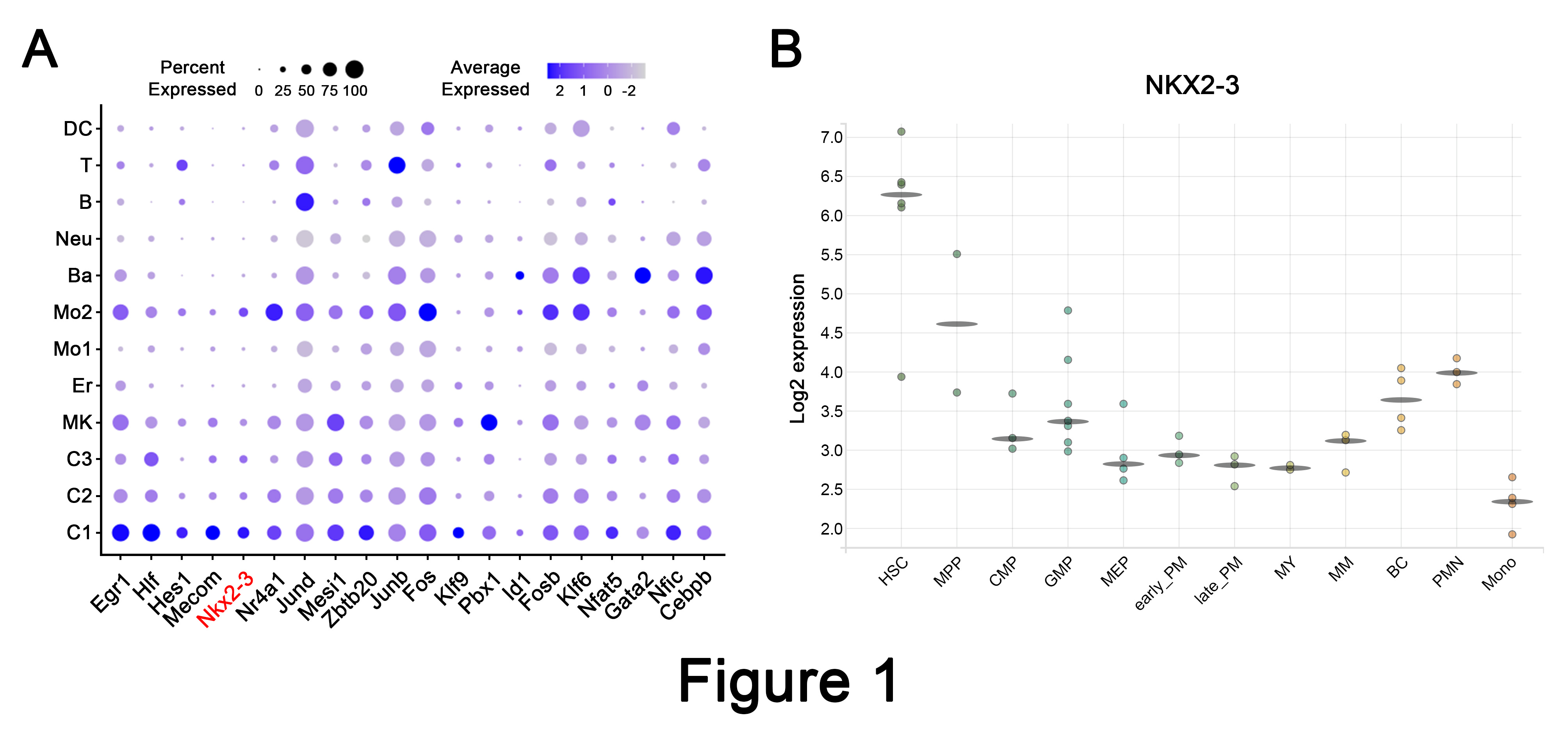 We first performed single-cell RNA sequencing (scRNA-seq) analysis of murine hematopoietic stem progenitor cells (HSPCs) and identified 12 different cell populations. It was found that Nkx2-3 was highly expressed in the most primitive HSC population (C1 cluster). Indeed, its expression pattern was similar to previously identified HSC regulators, such as Egr1, Hlf, Hes1, Mecom, Nr4a1, etc. Of note, NKX2-3 expression was also highly enriched in human HSCs (Figure 1).
