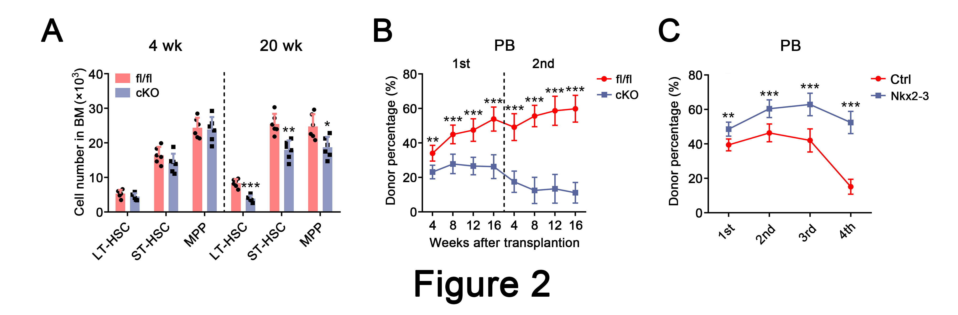 To determine the role of Nkx2-3 in HSCs, we used a conditional Nkx2-3 knockout mouse model (Nkx2-3fl/fl/Mx1-Cre). Intriguingly, we found that the number of HSCs was largely unchanged at 4 weeks but was significantly decreased at 20 weeks in Nkx2-3cKO mice after pIpC injection. To test whether Nkx2-3 deletion affects HSC potential to self-renew, we then performed a competitive bone marrow transplantation assay and found that the long-term hematopoietic reconstruction ability of HSCs was remarkably dampened after Nkx2-3 ablation. In contrast, overexpression of Nkx2-3 improved HSC function (Figure 2).
