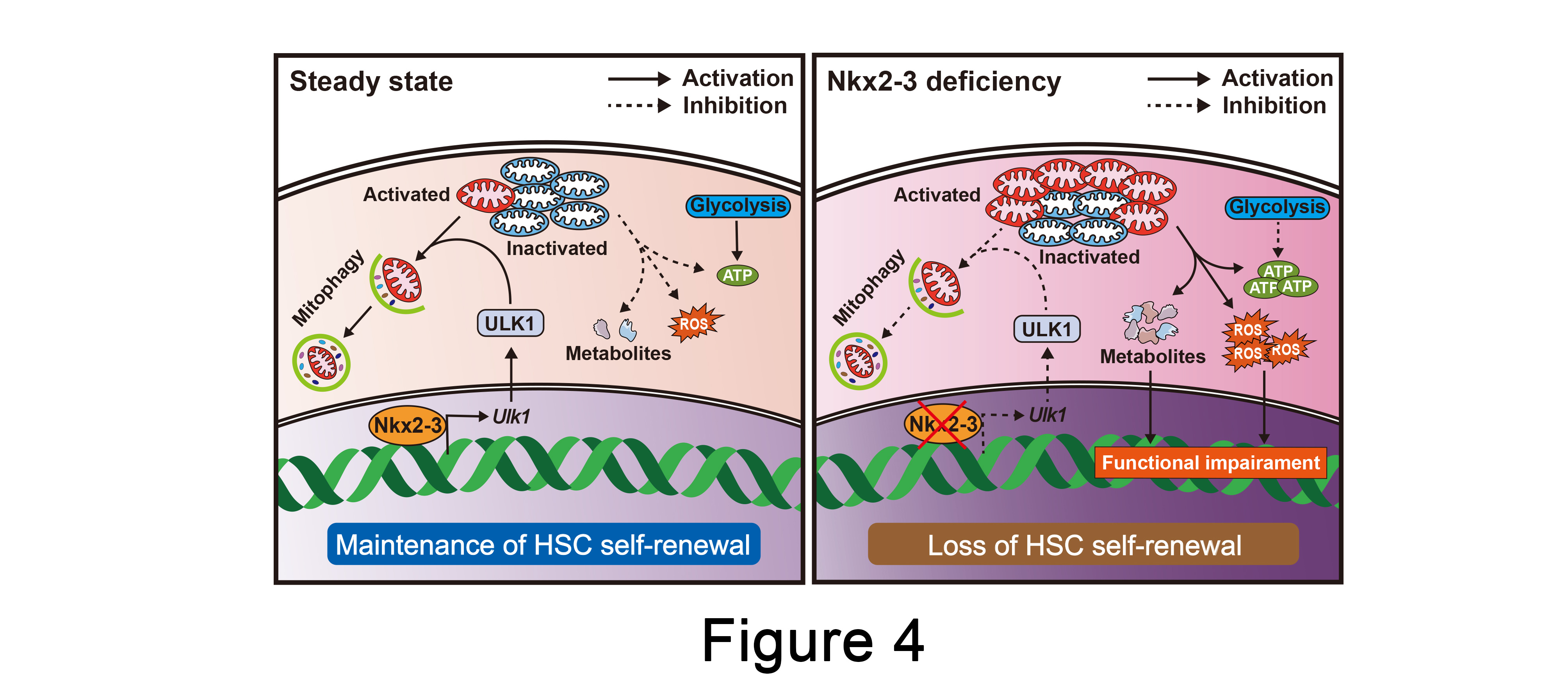 Mitochondrial homeostasis is maintained by a combination of biosynthesis, fusion/fission and autophagy, also known as mitophagy [5-7]. In this study, we show for the first time that Nkx2-3/ULK1 pathway-mediated mitophagy plays an important role in sustaining the self-renewal capacity of HSCs. We find that the transcription factor Nkx2-3 is specifically enriched in HSCs and its deficiency results in gradual decreases in HSC number and long-term reconstitution ability in both mice and humans. Mechanistically, Nkx2-3 promotes the metabolic fitness of HSCs by directly regulating the transcription of ULK1, which is required to clear activated mitochondria via mitophagy. Collectively, our findings unveil new insights into the mitophagy regulation of HSCs.