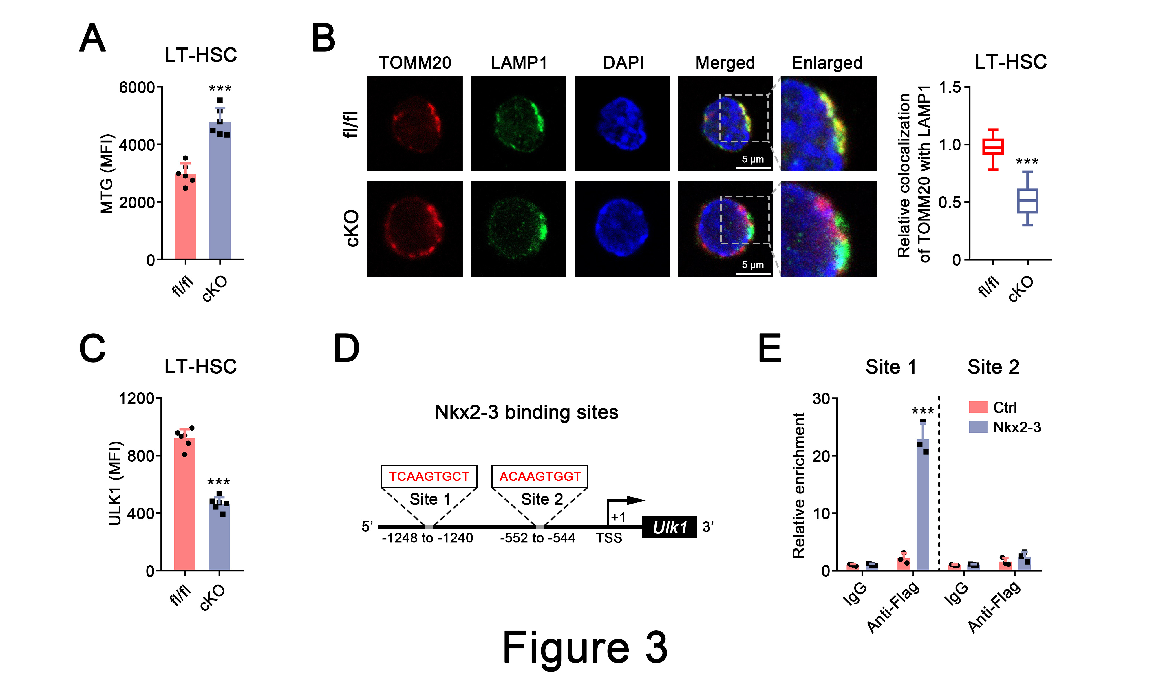 Further investigations showed that Nkx2-3 deficiency resulted in the accumulation of activated mitochondria in HSCs due to impaired mitophagy. Importantly, we found a significant decrease in the expression of ULK1, a critical mitophagy regulator, in HSCs following Nkx2-3 deletion. Moreover, mechanistic studies revealed that Nkx2-3 could directly bind to the Ulk1 promoter region and thus regulated its expression in HSCs (Figure 3).