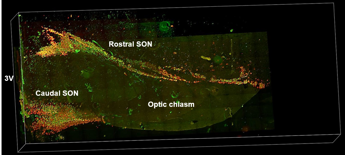 This project studying the transcriptomic plasticity of SON – the hypothalamic osmoregulatory control centre of the dromedary camel – started with three-dimensional mapping of the camel SON (Figure 1, Movie 1) based on the expression of the AVP and OXT mRNAs to facilitate SON sampling. Different from the rodent SONs, the camel SON revealed a distinct spatial structure that including two separate subpopulations of magnocellular cells that make these hormones. We named them the rostral SON and caudal SON, regarding their relative location along the rostral-caudal axis in the brain.