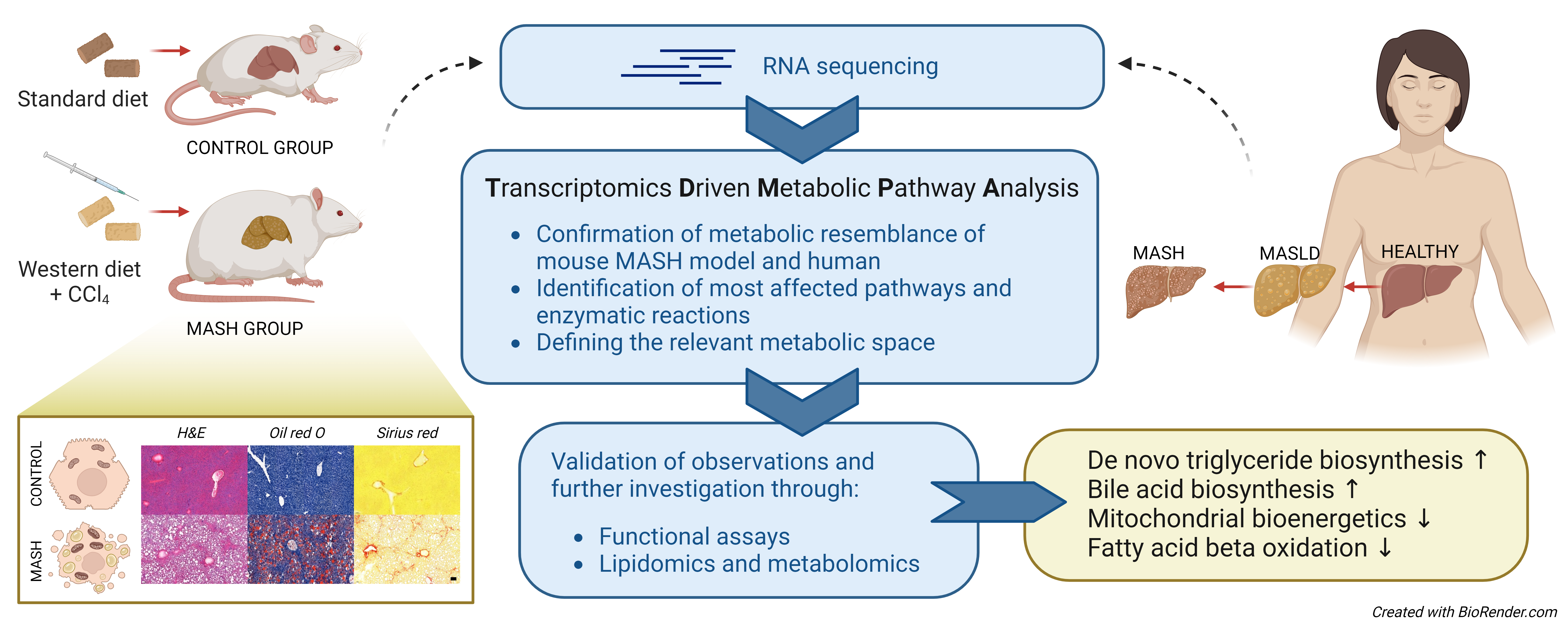 Over the past decades, computational models of metabolism such as genome-scale metabolic models (GEMs) have been used together with experiments to provide an additional level of granularity and insight. We developed transcriptomics-driven metabolic pathway analysis (TDMPA), a method that uses gene expression data and GEMs to systematically evaluate metabolic pathway alterations that characterize the disease. By comparing these findings with the corresponding ones in human, TDMPA assesses the suitability of animal models, and provides a comprehensive understanding of the metabolic changes associated with MASLD and MASH. Additionally, TDMPA helps to define the metabolic space for further investigation through functional assays and metabolomics experiments. Our study’s complete workflow is presented in Figure 1.