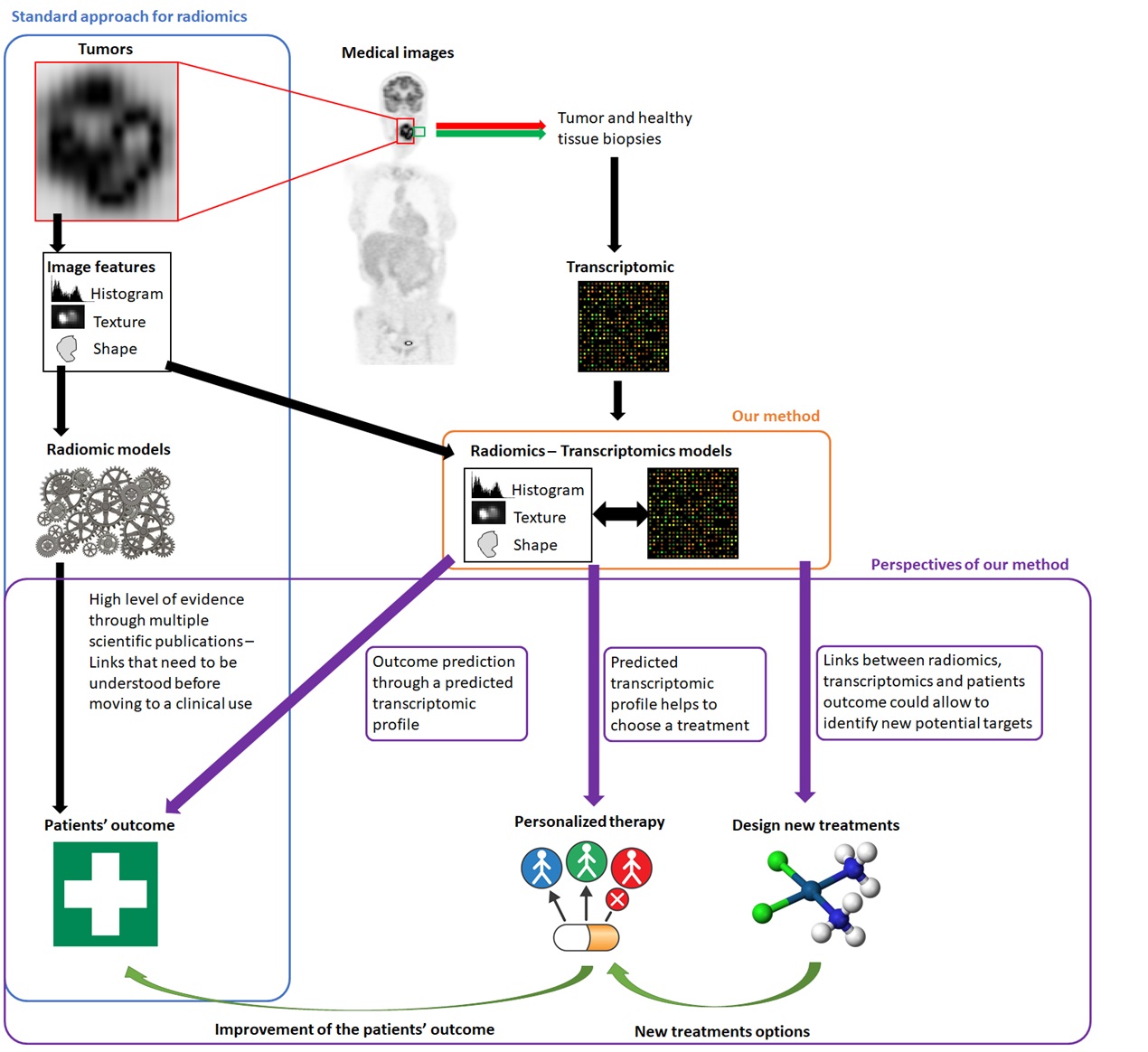The interest for radiomics has raised exponentially (from 2 publications in 2012 up to more than 700 in 2019, according to Web of Science), with a strong increase in the confidence level of the clinical value of radiomics, thanks to improvements in methodology and use of increasingly larger cohorts of patients. However, the limited ability of clinicians to translate radiomic features into biological processes is a major limitation for integration in routine clinical practice. Indeed, radiomic features can capture details in images that the naked eye, even the expert one, cannot necessarily appraise. Hence, our results help understanding the radiomics prognostic and predictive value observed in previous studies. They also strengthen the value of radiomics as a promising approach to personalize treatments through targeting tumor-specific molecular processes. We can foresee the possibility, that routinely acquired medical images may ideally complement a clinical evaluation with radiomics-based interpretation of the underlying activity of gene expression pathways. This should in turn allow to select the most appropriate therapy treatment as well as to predict outcome. The method we developed has several advantages. Firstly, we performed the analyses with no a priori consideration of the gene expression patterns from previous knowledge. Consequently, this approach could allow discovering potential new targets for the design of innovative treatments. Secondly, the approach provides a biological meaning for the radiomic signatures, which may in turn allow moving a step further towards the potential use of radiomics in clinics.