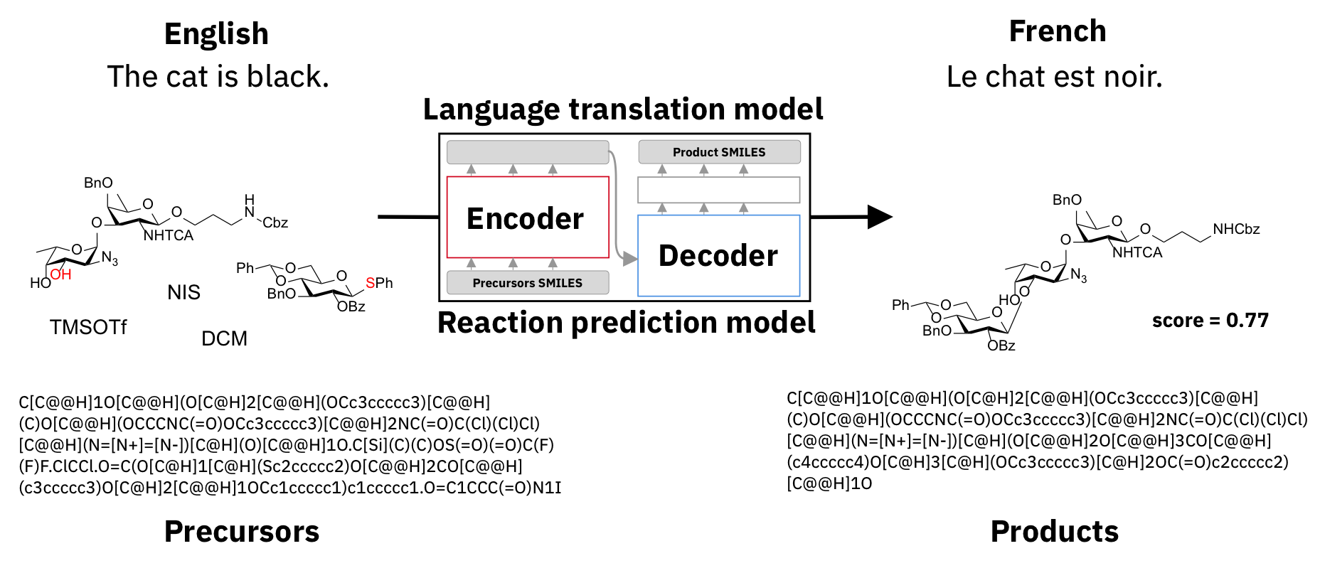 The most successful approach for reaction prediction to date is the Molecular Transformer [1]. This transformer architecture, initially introduced for neural machine translation [2], works with a text-based representation of molecules called SMILES. In contrast to human language transformer, the Molecular transformer does not learn a translation function from one language (e.g. English) to another (e.g. French) but a translation function from precursors to products (Figure 1). Similar to a human, the model learns from examples. By repeatedly seeing millions of chemical reactions, it captures the underlying patterns of the transformations. After training, given an unseen input (precursors), the trained model can predict the most likely outcomes of the reaction (products).