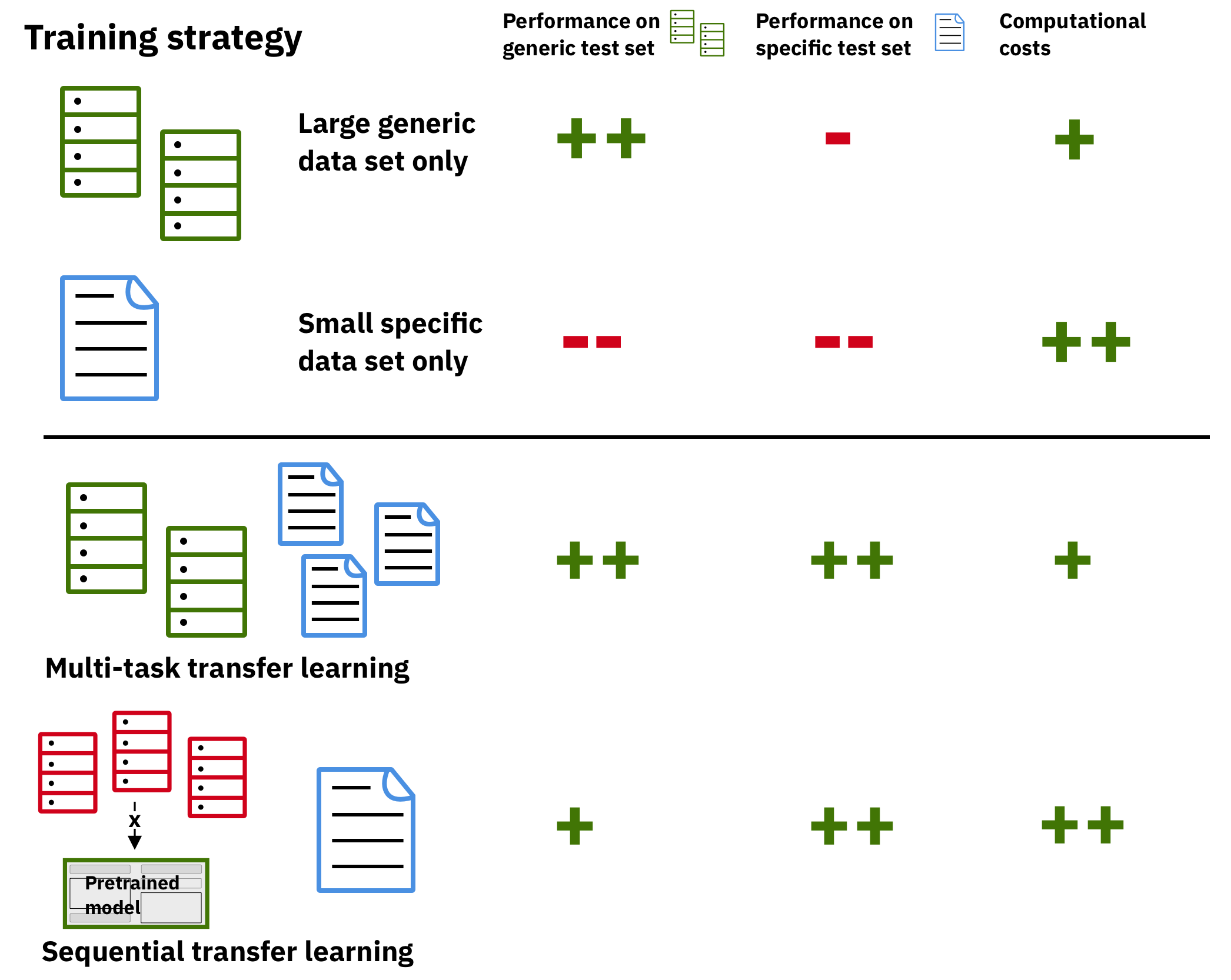 In "Transfer Learning Enables the Molecular Transformer to Predict Regio- and Stereoselective Reactions on Carbohydrates" [3], we investigated different strategies to push the limits of current reaction prediction models and teach them to predict more complex reactions, which are challenging to predict even for human experts. Inspired by the current trends in Natural Language Processing, we applied transfer learning and explored two real-world scenarios (Figure 2). Transfer learning exploits the knowledge extracted from abundant generic data (here patent reactions) to improve predictions on a specific task where less data is available (carbohydrates reactions). While in multi-task training strategy the model has access to both data sets simultaneously (48 hours on 1 GPU), in the sequential training strategy a model pretrained on the patent reactions is then specialised on the carbohydrate reactions (1.5 hours on 1 GPU). The latter training is not only much faster but particularly useful when the generic data set (e.g. proprietary data) cannot be shared.