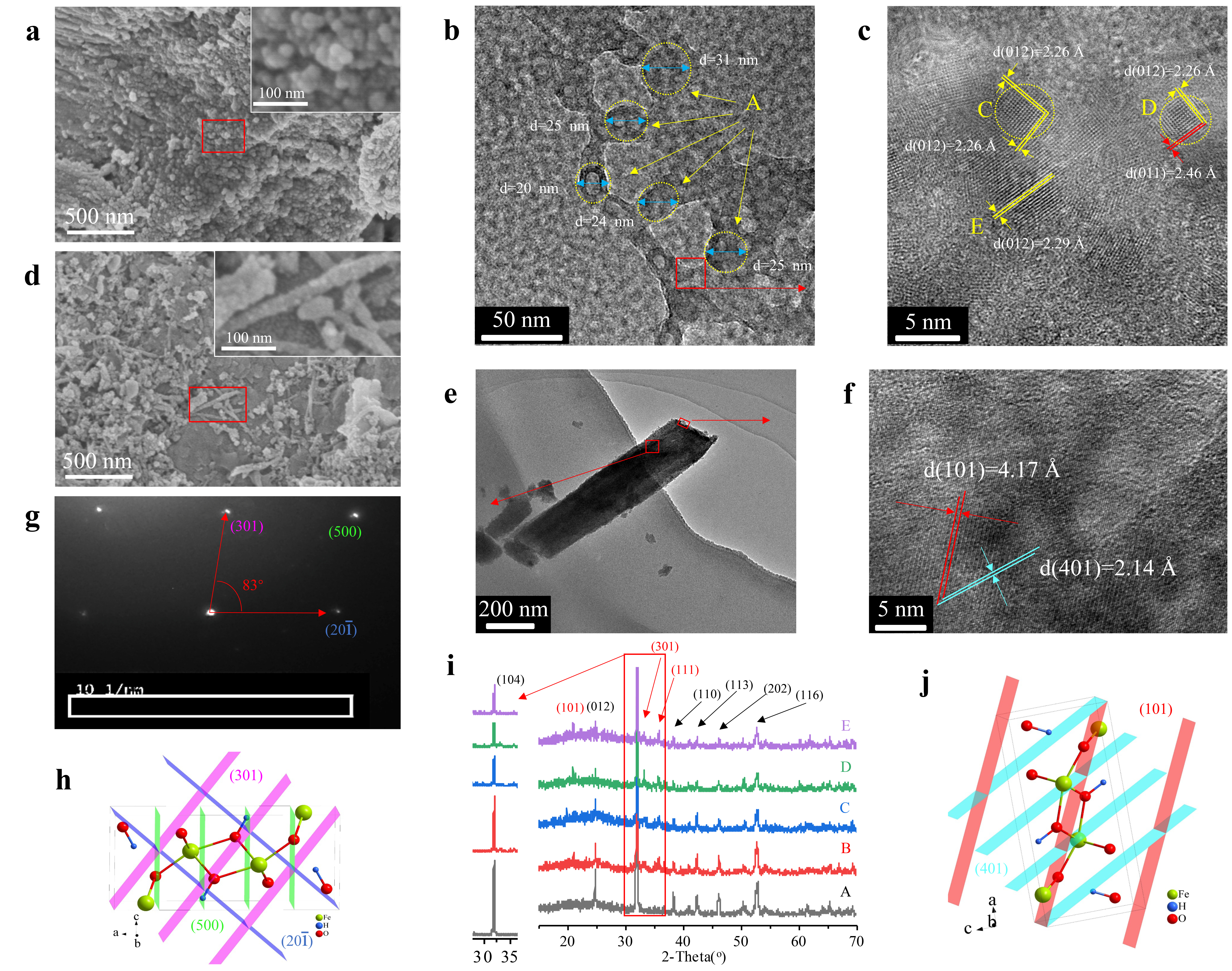 Fig. 1. Characterization of the precipitates. Representative SEM (a and d) and TEM (b and e), HRTEM (c and f), and SAED (g) images of the precipitates of siderite after reacting with HA (2 mg/L); the XRD (i) pattern of the synthesized siderite after reacting with 0 mg/L (i-A), 0.5 mg/L (i-B), 1 mg/L (i-C), 2 mg/L (i-D) and 10 mg/L HA (i-E); schematic diagrams of goethite (h and j) unit cell structures, which were drawn by the Diamond 3.2 software (Crystal Impact GbR, Germany). Samples were freeze-dried for 12 h after 7 days of aging. The concentration of dissolved oxygen (DO) were 4 mg/L.
