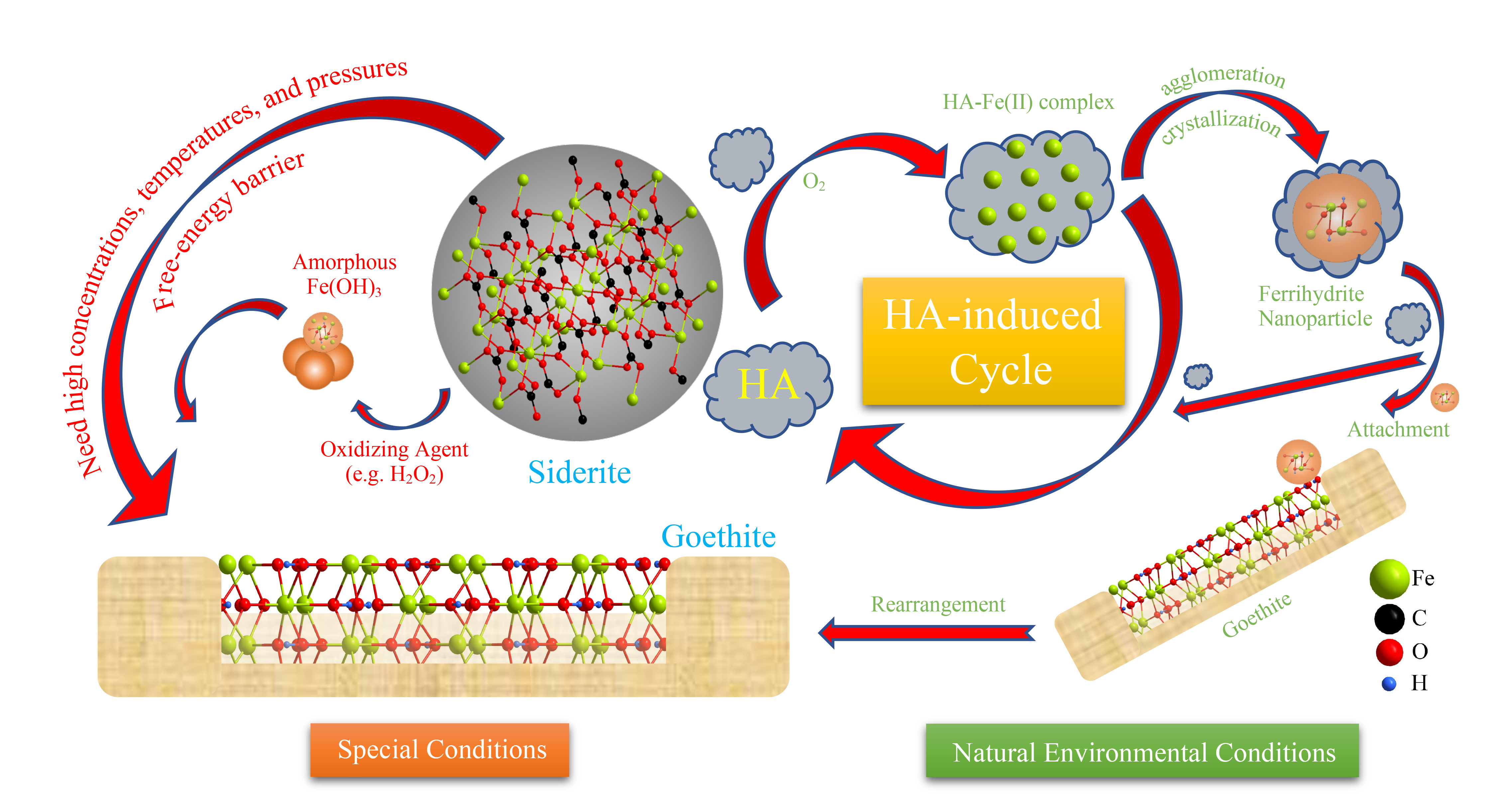 Iron is the fourth most abundant element, which can form complexes with elements such as C, N, O, and S, making it an essential element for nearly all living organisms. The environmental iron-bearing mineral phases (such as the iron oxides) are aggregates of nano-particles whose performance of adsorption and release of nutrients and metals are highly dependent on the particle size, crystallinity and transformation product. Hence, it is important to understand and reveal the transformation and crystallization mechanisms of such minerals in the natural environment.