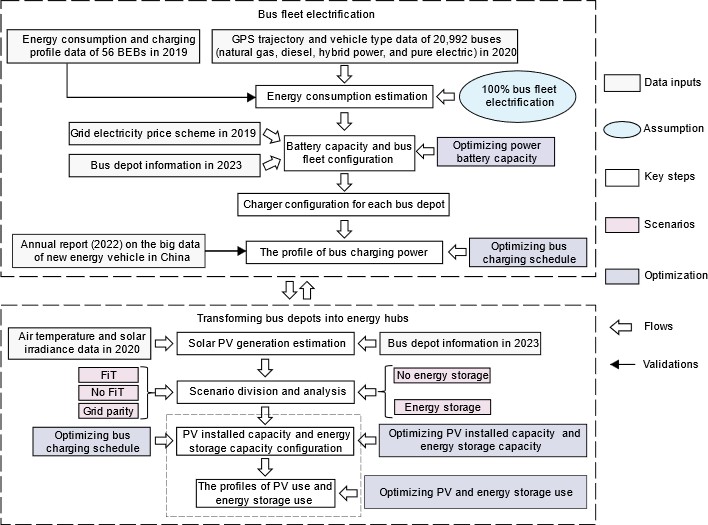 Our framework first simulates a baseline scenario in which BEBs replace all buses of other fuel types in Beijing. The complete bus fleet electrification is simulated from bus GPS trajectory data, vehicle type data, grid electricity price schemes, and bus depot data. These four real-world datasets are used to simulate BEB energy consumption, optimize BEB battery capacities, and optimize BEB charging schedules under perfect foresight. To transform bus depots into energy hubs, we estimate solar PV generation based on bus depot data, air temperature data, and solar irradiance data. Combined with three scenarios related to subsidy policies for solar PV, we maximize the economic profits for solar PV and energy storage by optimizing the installed capacity of solar PV, energy storage capacity, bus charging schedules, solar PV use, and energy storage use. This work uses Beijing’s entire public bus transport network to illustrate how the different datasets are used to quantify the technical, economic, and environmental benefits of transforming PT depots into energy hubs. This work outlines the daily BEB charging load curves at each bus depot under a 100% electrified bus system scenario. The works simulates daily BEB charging schedules, solar PV usage, and energy storage usage, offering minute-by-minute resolution and accounting for seasonal variations.