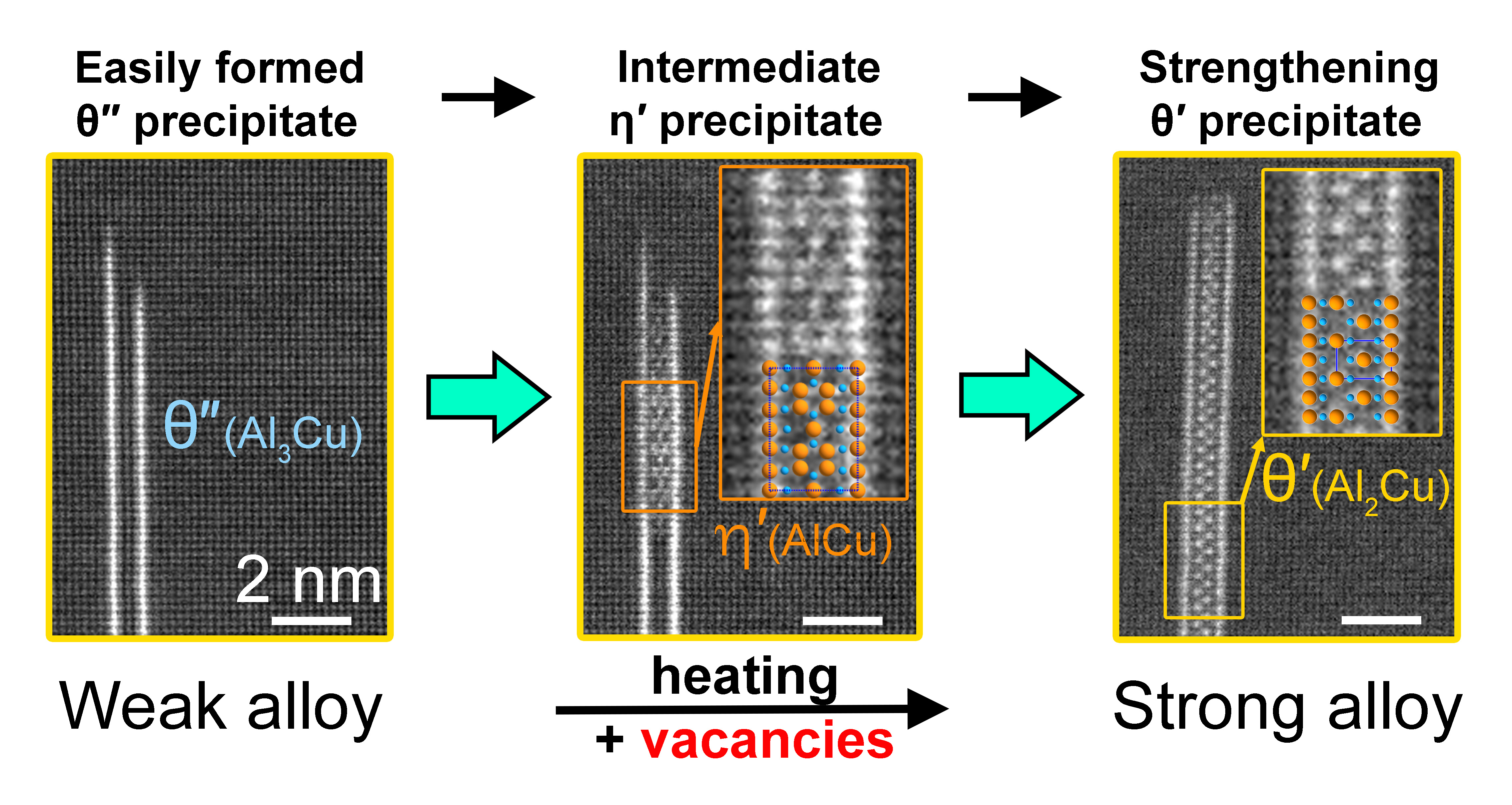 Figure 1. The θ′ phase (right) is an important strengthening precipitate phase in many light aluminium alloys. Unfortunately, its homogeneous nucleation is difficult, in contrast to the θ″ phase (left), which has poor strengthening ability. In our recent Nature Communications paper [1], we show that the θ″ phase can transform into the θ′ phase thanks to vacancies (a type of fundamental crystalline defect). This can take place via a previously unknown intermediate phase η′ (middle). The transformation was captured by atomic-resolution high-angle annular dark field scanning transmission electron microscopy.