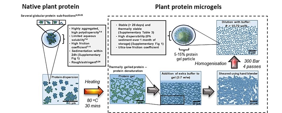 So what is missing? In taste, much focus has been undertaken to mask off flavours, often ultra-formulation approaches have been used with addition of higher fat, sugar, salt and other additives that reduces their healthiness potential. What has been overshadowed however is the undesirable texture, such as astringency that is often termed as “dry”, “non-juicy”, “gritty” in various plant protein-based formulated foods. These perceptions are mechanosensations that are hypothetically linked to raising oral friction or lubrication failure. In this paper, we have converted these poorly lubricating plant proteins into ultralubricating, hydrated structures called “microgels” to relieve poor textural performance.