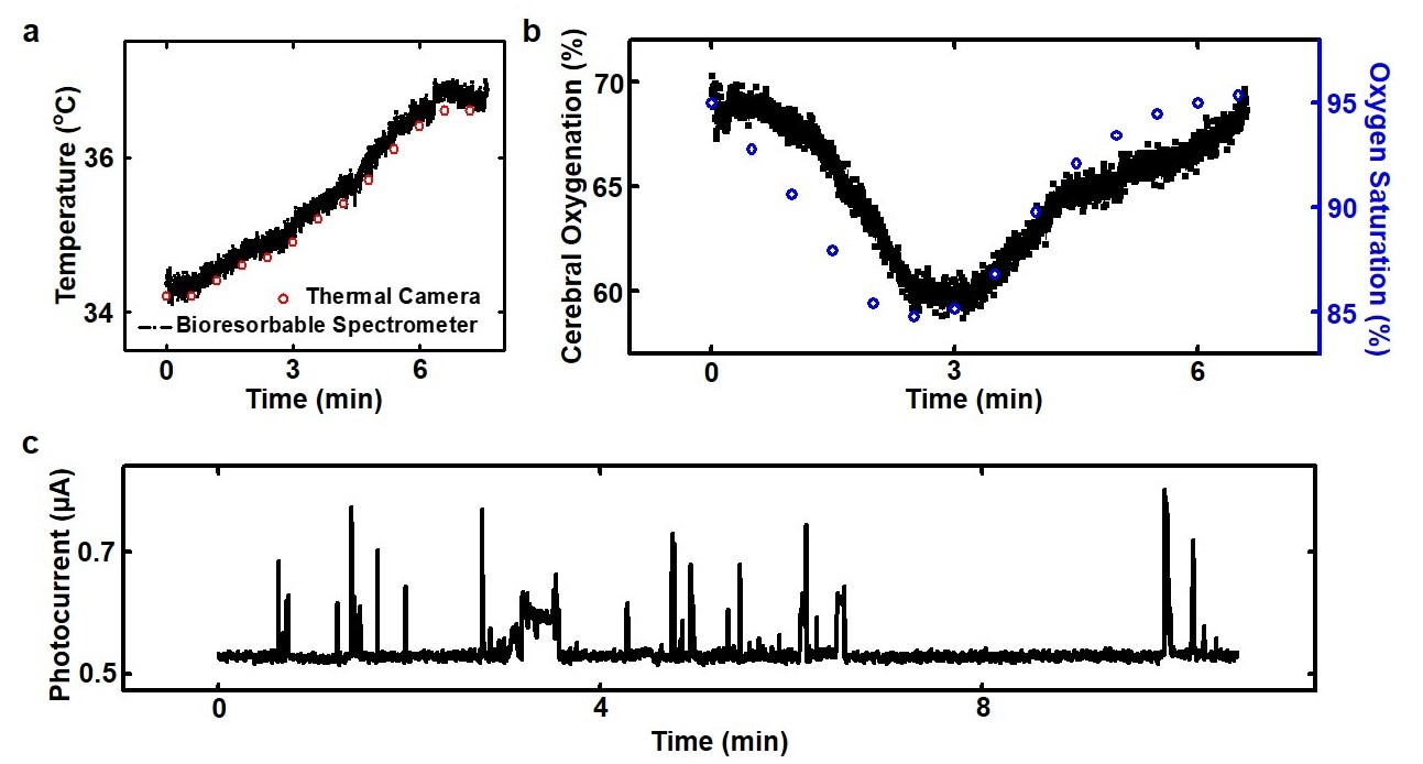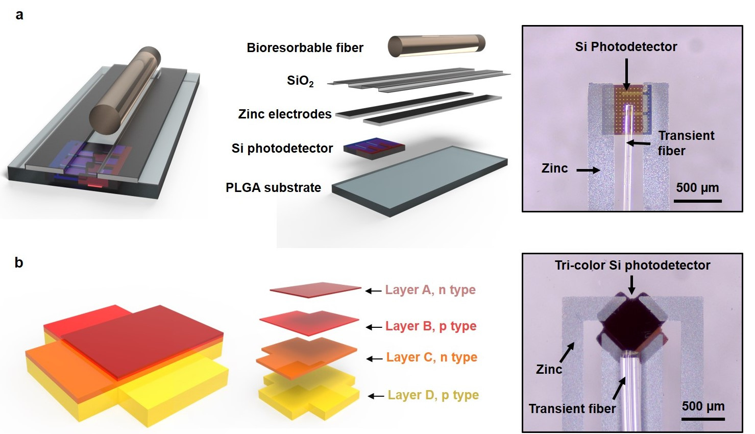 In this work, we aim to establish a collection of techniques that qualitatively increases the capabilities of such types of bioresorbable systems. Specifically, we introduce a set of building block components -- multiwavelength photodetectors (Figure 1), multilayer filters (Figure 2) and fiber optic probes (Figure 1) – that can be assembled into platforms capable of full spectroscopic characterization of targeted tissues inside the body. In vivo demonstrations of multifunctional bioresorbable devices for full spectral and thermal characterization of biotissues and biofluids, continuously and in real time, in the context of neural activity and metabolic processes, illustrate some of the resulting possibilities (Figure 3).