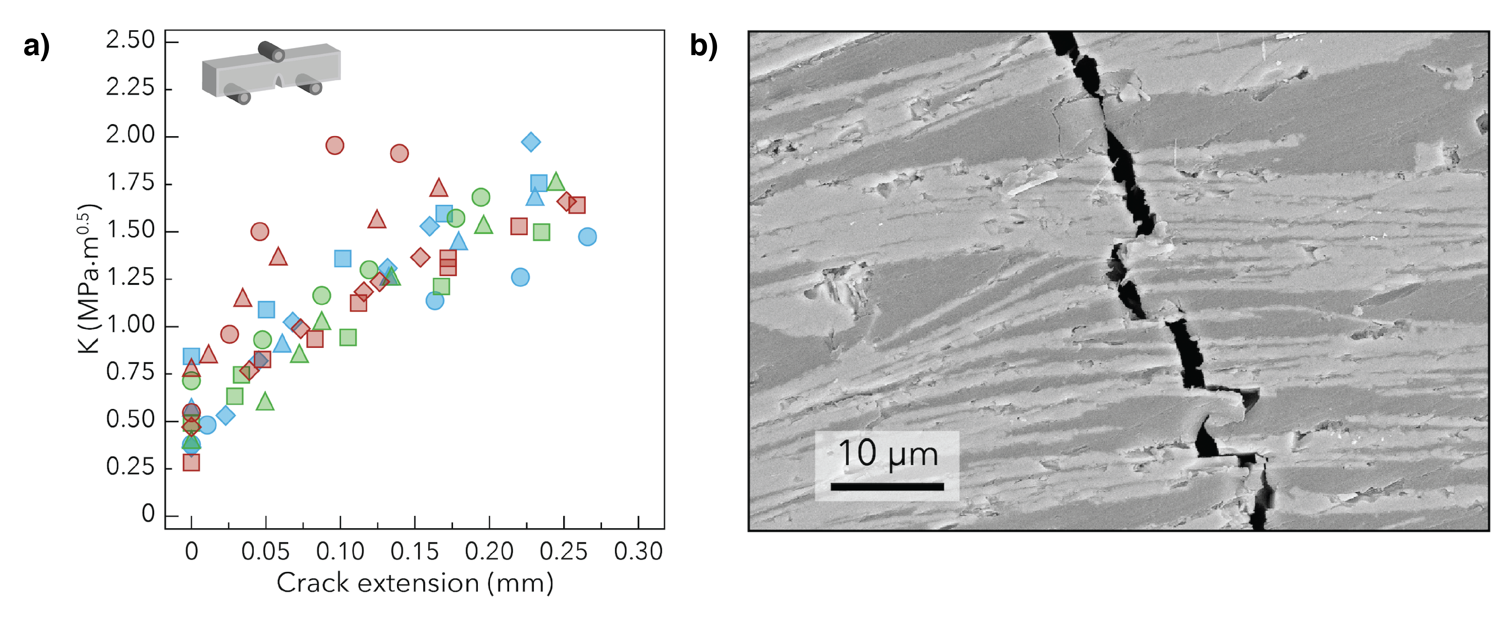 Figure 2 | Fracture properties of the transparent nacre-like composites. a, Crack growth resistance curves of the bulk nacre-like composites. b, Scanning electron micrograph highlighting the fracture path within the composite.