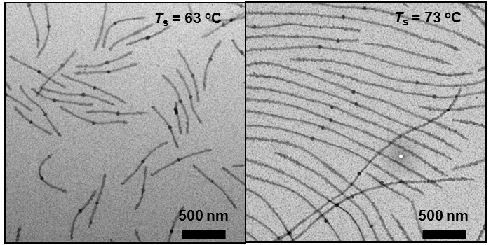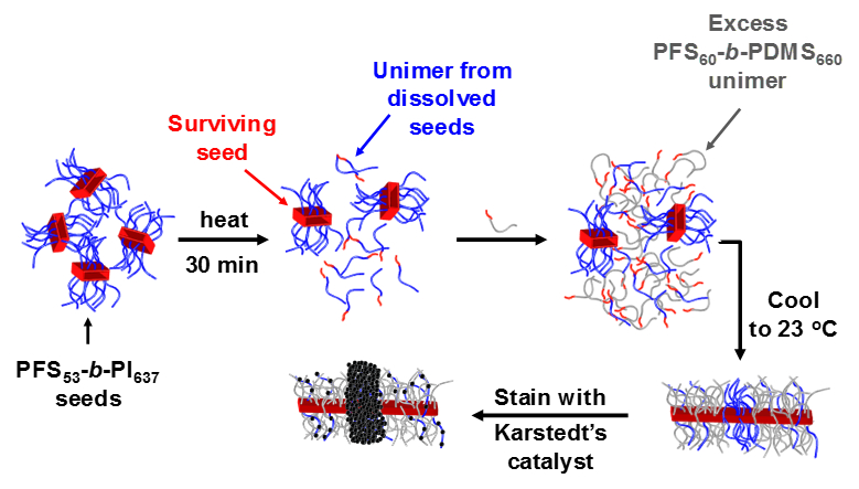 For our experiments, dilute solutions of PFS-b-PI crystallites were annealed at different self-seeding temperatures. Before cooling, we injected a large excess of PFS-b-PDMS unimer to trap the surviving crystallites. During recrystallization, the large excess of PFS-b-PDMS unimer (and PFS-b-PI unimer coming from the dissolved crystallites) add to the ends of the surviving crystallites to form M(PFS-PI)-r-M(PFS-PDMS)-b-M(PFS-PI)-b-M(PFS-PDMS)-r-M(PFS-PI) triblock co-micelles, with the trapped seeds located at the center. After selective staining of the PI block, the surviving crystallites could easily be observed by transmission electron microscopy (TEM), shining light into the self-seeding black box, even when very few crystallites survived.
