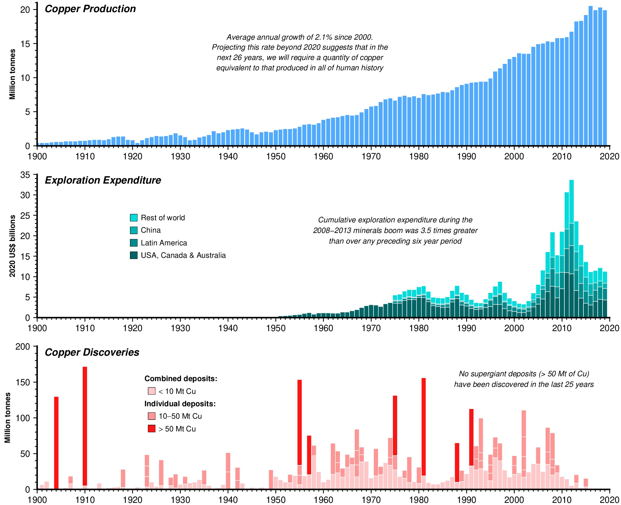 The 2015 Paris Agreement set an ambitious goal of limiting the increase in global average temperature to less than 2°C above pre-industrial levels by 2050. Achieving this target will require drastic changes to our manufacturing and energy sectors. For example, a recent study has suggested that between 2015 and 2050, the number of electric passenger vehicles needs to increase from 1.2 million to ~1 billion, battery capacity must rise from 0.5 to >12,000 gigawatt-hours, and solar photovoltaic capacity must increase from 223 GW to >7000 GW. This year, the World Bank released a report projecting that over 3 billion tonnes of minerals and metals will be needed to deploy the necessary wind, solar, and geothermal power, as well as energy storage, to meet these goals. As a result, metal demand over the coming decades is forecast to grow substantially beyond our current rates of supply, necessitating improvements both in the efficiency of recycling and in rates of mineral exploration success.