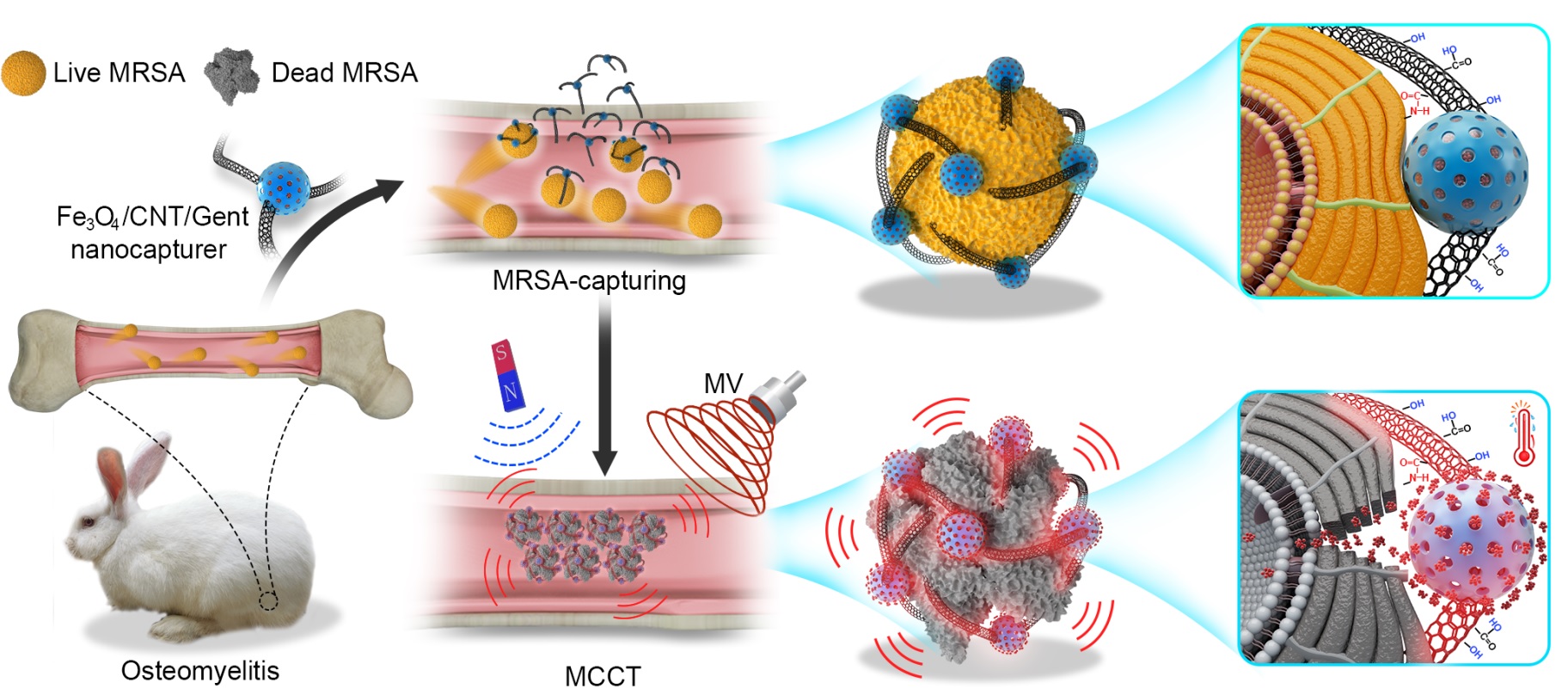 In our most recent study in Nature Communications, our team present a possible solution for such deep tissue infection. We first choose microwaves (MV), which has deeper penetration ability than light, as the external stimulus source. Then we design a microwave responsive agent Fe3O4/CNT, which can not only respond to external microwaves to generate microwaveocaloric, but also target and capture bacteria through the oxygen-containing functional groups on the CNT. To minimize the adverse effects of hyperthermia induced by MV, an effective strategy of eradicating deep tissue infection is to combine microwaveocaloric therapy (MCT) with chemotherapy. Therefore, we load gentamicin (Gent) on the microwave responsive agent and use the phase change material, which can change between solid and liquid after temperature stimulation, to control the release of the drug.