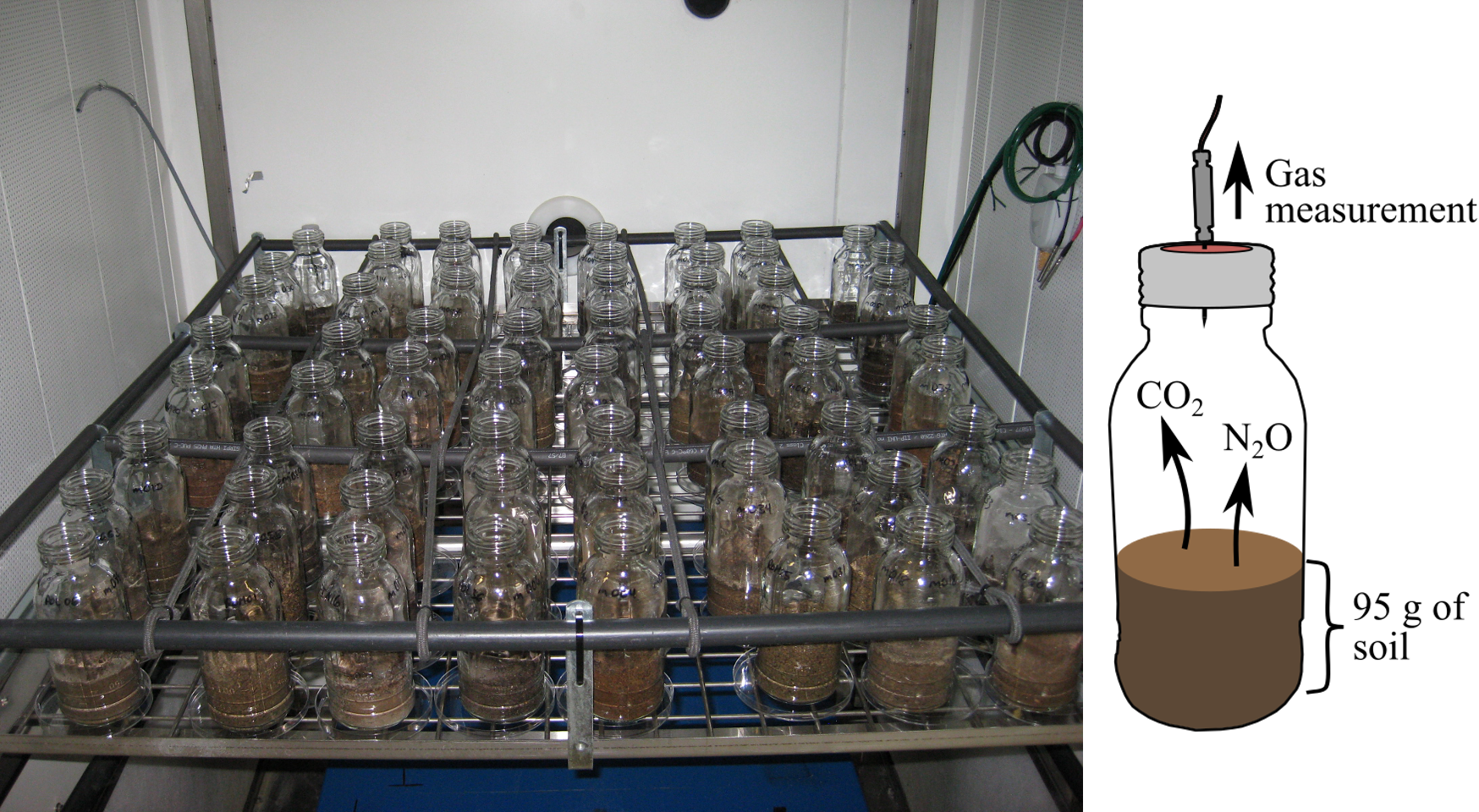 Once back in Montpellier with my precious samples, I started the microcosm experiment at the Montpellier European Ecotron. I meticulously filled 384 glass vials with the soil painstakingly sampled from the field. I exposed half of the microcosms to two drying and rewetting cycles, measuring soil microbial activity (CO2 and N2O fluxes) at key moments: before drought, at the end of the drought, and after the rewetting. The microbial activity of the other half of the soil was kept at ideal humidity to act as a control and was measured concurrently.