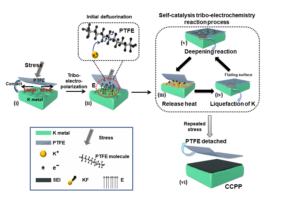Taking these into consideration, we conclude that the charges accumulated on PTFE trigger the powerful reaction. Once a pressure is applied, a lateral shear occurs between K and PTFE. That is, there is a friction interaction between the two, causing the transfer of charge between each other, as shown in Figure 1 (ⅰ). The extra electrons lead to a high tribo-electric field (Figure 1 (ⅱ)), acting as the catalyzer and triggering the reaction. External force is only the initiator to the charge.