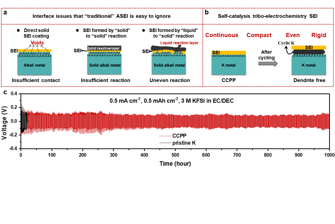 Figure 3. (a) Interface issues often ignored by three “traditional” ASEI construction strategies. (b) Inhibition of dendrites by CCPP electrode, which SEI constructed by self-catalysis tribo-electrochemistry reaction. (c) Voltage-time profiles of CCPP and pristine K.