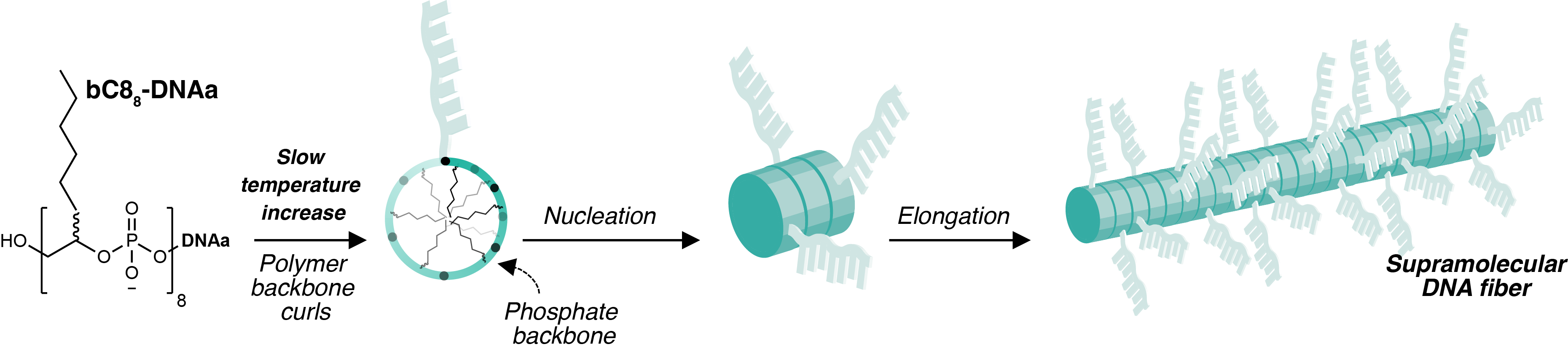 Through the contributions of various colleagues and collaborators, we found that the explanation for this unusual behaviour was the requirement for the DNA-poymer to assume a specific conformation in order to form fibers. Heating provided the necessary energy input to convert the DNA-polymer from a globular state to a structured one. At room temperature the DNA-polymer was compeltely soluble in aqueous solution, but upon heating nanofibers remarkably nucleated and elongated, growing longer as the temperature increased beyond 90 °C (Figure 2). Further, we found that the propensity to form the high-energy conformation was dependent on the DNA-polymer length: more hydrophobic character was geometrically unsuited for fiber-formation.