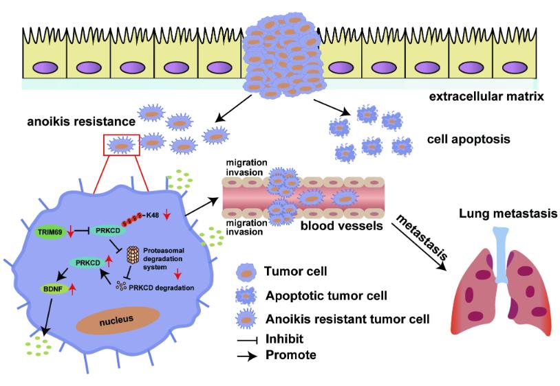 In summary, we investigated the novel role of TRIM69 in anoikis resistance and metastasis in GC and revealed a new mechanism for the regulation of PRKCD expression by TRIM69-mediated ubiquitination and degradation. Furthermore, TRIM69/PRKCD signaling was found to suppress anoikis resistance and metastasis by inhibiting BDNF expression. Hence, it is of great value to develop therapeutic approaches targeting TRIM69 or blocking PRKCD/BDNF as potential GC interventions.