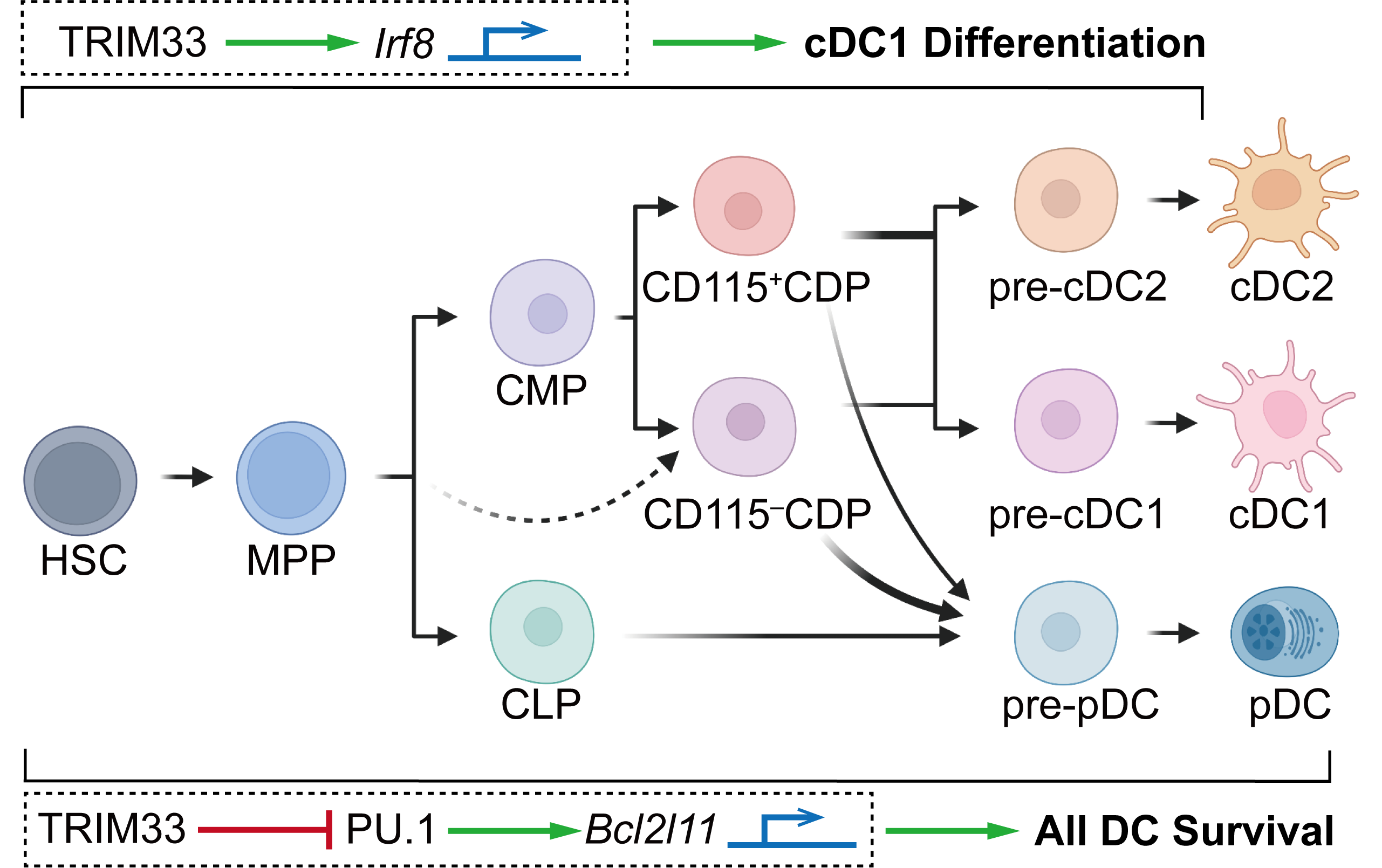 Our laboratory has long been focusing on the regulation of dendritic cell (DC) development. DC homeostasis is pivotal for appropriate innate and adaptive immunity1. In addition to the transcription factors and epigenetic modifiers we determined previously2-5, our current study identified TRIM33 as a critical regulator for DC differentiation and survival.