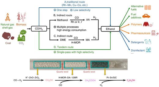 We have succeeded in develop new tandem catalytic systems for direct synthesis of ethanol with high ethanol selectivity. We found that the integration of methanol synthesis, methanol carbonylation and acetic acid hydrogenation in tandem in one reactor could accomplish the highly selective conversion of syngas into ethanol. We have demonstrated that the K+–ZnO–ZrO2 catalyzed syngas conversion to methanol and the H-MOR functioned for methanol carbonylation to acetic acid, which was then hydrogenated to ethanol over the Pt–Sn/SiC catalyst. In the combination of K+−ZnO−ZrO2│HMOR−DA−12MR│Pt−Sn/SiC,