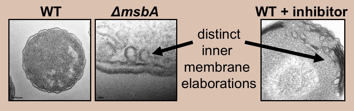 One of the most powerful secondary assays we next employed was the analysis of inhibitor-treated bacterial cells by electron microscopy. Only those compounds specifically targeting MsbA mimicked the cytosolic membrane elaboration phenotype that is a hallmark of msbA loss-of-function. So striking and telling was this phenotype that one of our most memorable team meetings was when the first microscopy results were revealed for a pathogenic strain of Escherichia coli treated with inhibitor.