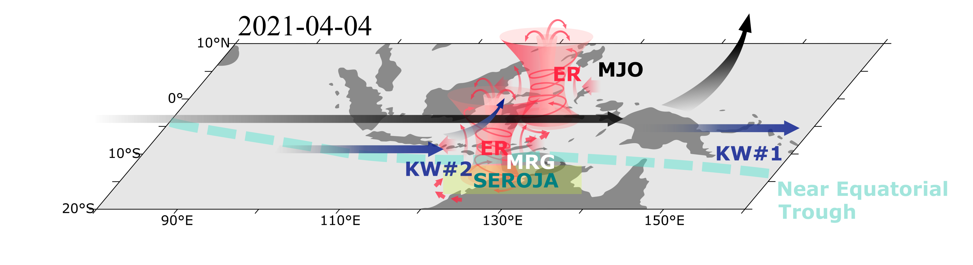 The largest of these weather systems, the "Madden-Julian Oscillation," moved slowly eastward from the Indian Ocean over Indonesia. The interaction between two "Kelvin waves" and a "Rossby wave" spun up the initial vortex and accelerated the cyclone's development.