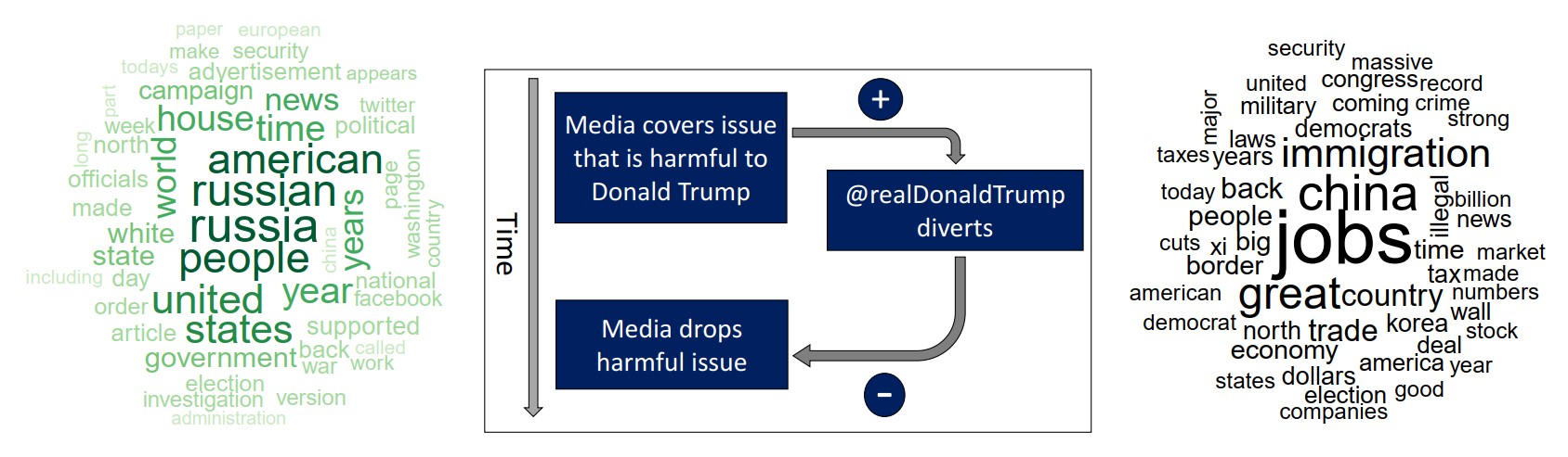 Our analysis therefore presents empirical evidence that is consistent with the hypothesis that President Trump’s tweets systematically divert attention away from a topic that is potentially harmful to him, which in turn appears to suppress media coverage of that topic.
