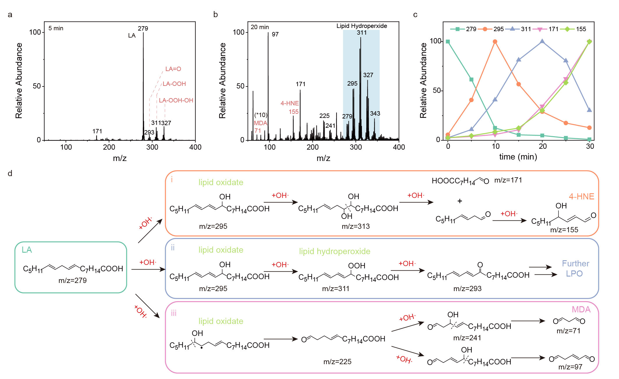 Furthermore, the of lipid peroxidation (LPO) process induced by ·OH generated under irradiation was monitored by mass spectrometry. As resulted, with the increase of irradiation time, lipids were oxidized to form lipid peroxides, which were further oxidized into cytotoxic small molecules (such as MDA and 4-HNE). The intermediates in the LPO process were captured and monitored by mass spectrometry within a 30 min irradiation (Figure 3). Besides, the corresponding in situ synthesis process, water splitting process, and the LPO process have been validated by in vitro experiments, which facilitates the efficient in vivo cancer therapy.