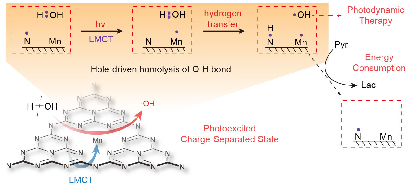 Under red light irradiation, the photoinduced charge-separation state in C3N4-Mn SACs is constructed via a LMCT process. Through a hole-driven homolysis of O-H bond, C3N4-Mn SACs could efficiently induce the O2-independent water splitting for efficient and selective ·OH generation. This minimizes the limitations of TME hypoxia or H2O2, facilitated the efficient Type-I PDT.