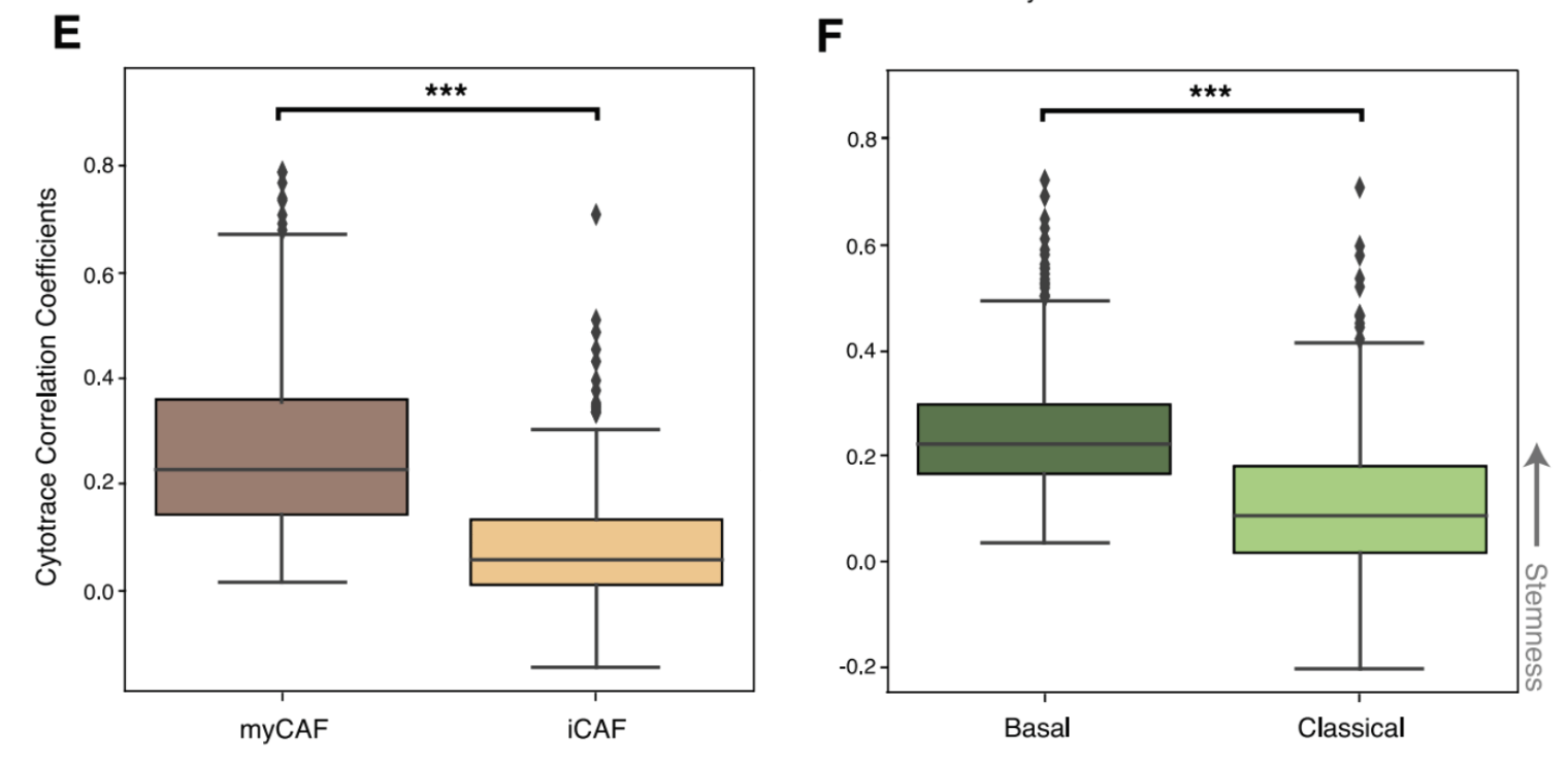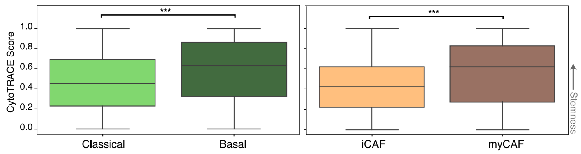 After identifying cell states in the single cell data, we then determined the developmental stemness of the malignant and CAF cell states using CytoTRACE (Gulati et al.). Basal-like malignant cells were more stem-like than their classical counterparts. This difference has been previously suggested in the literature, with the more aggressive basal-like subtype being more likely to undergo EMT, resulting in higher rates of metastasis. Interestingly, we also found that myCAFs are significantly more stem-like than iCAFs. (More on that later).