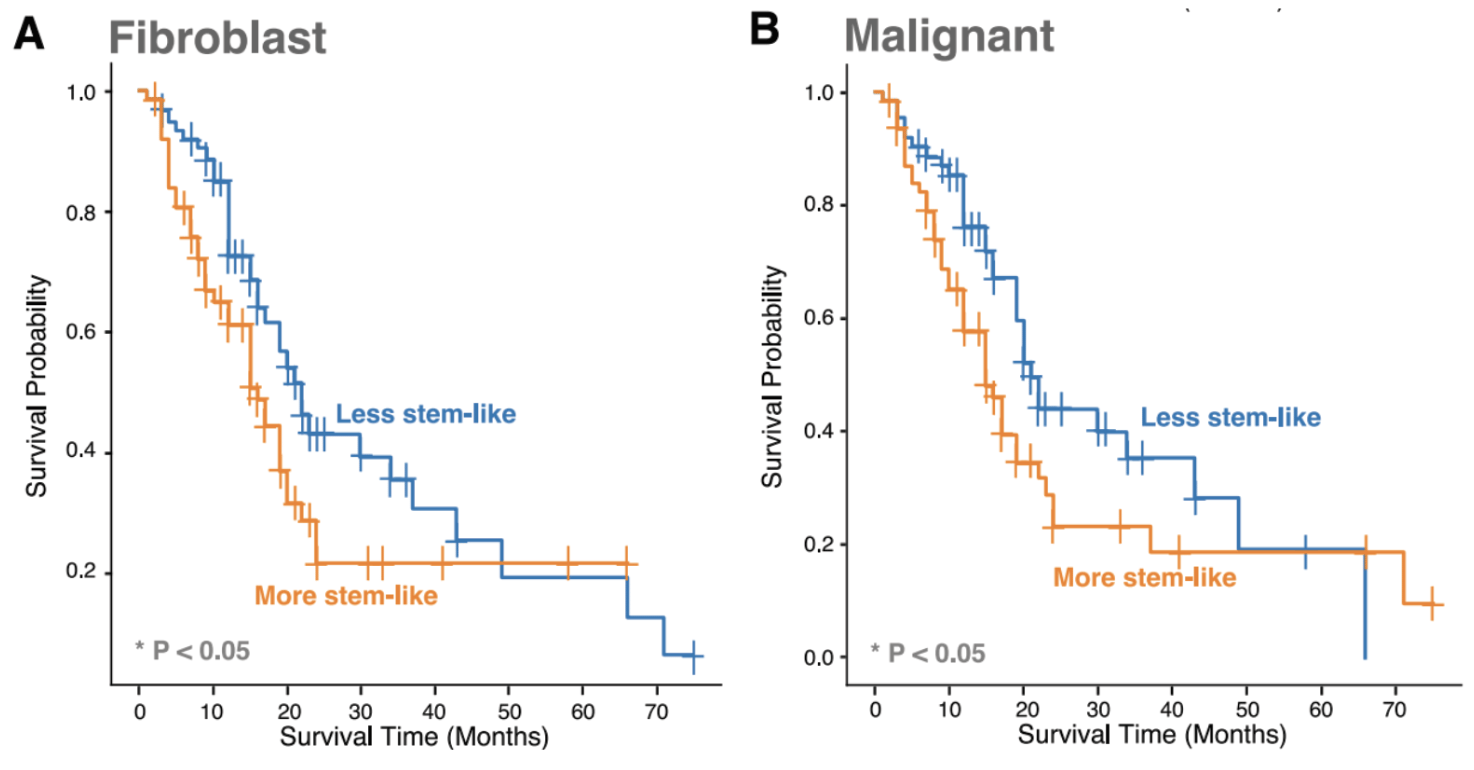 Given the developmental continuum in CAF and malignant cell states found in our single-cell data, along with pancreatic ecotype PE5’s enrichment for myCAFs and basal-like malignant cells, we more directly quantified the impact of stemness on patient survival for these cell states. To do so, we calculated a developmental stemness score for bulk RNA-seq samples. When partitioned into low vs. high stemness groups based on this score, we observed poor survival with more stem-like CAFs and malignant cells.