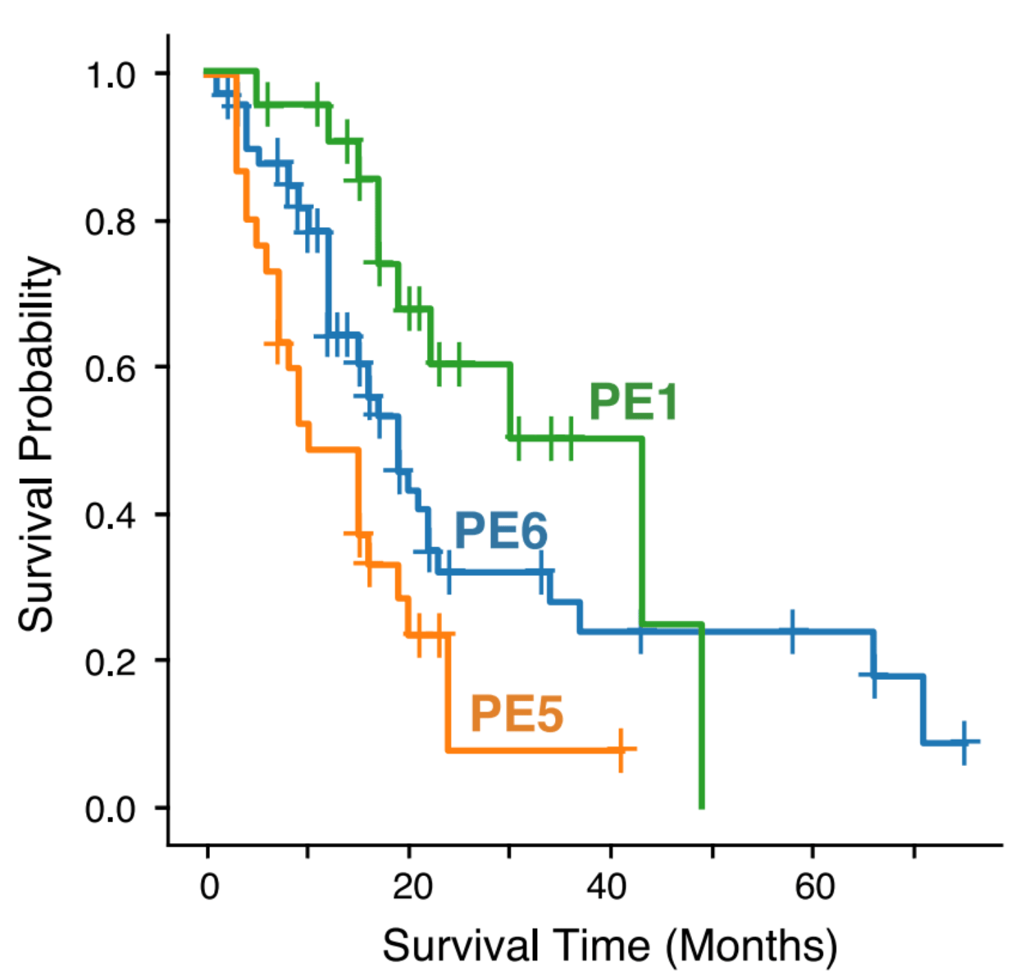 In contrast, PE1 and PE6 were associated with better survival outcomes than PE5. PE1 is immune enriched, containing plasma cells, mast cells, B cells, and FCN1+ TAMs, while PE6 contains CD4 T cells and classical malignant cells.