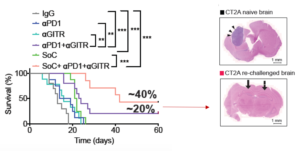 Regulatory T cells in the brain can be reprogrammed from guarding glioblastoma tumors to attacking them from within. In our work, we exploited the preferential accumulation of Tregs in the tumor by therapeutically altering their function – a strategy known as “reprogramming” – to make them kill cancer cells instead of protecting them. We collaborated with Dr. Hye-Jung Kim, an immunologist at Dana-Farber Cancer Institute, toward finding an appropriate Treg reprogramming strategy tailored to GBM. Based on our genetic and proteomic profiling of GBM Tregs and systemic Tregs, we targeted glucocorticoid-induced TNFR-related receptor (GITR) that is preferentially expressed in GBM Tregs with an agonistic antibody (αGITR). Upon antibody-mediated engagement of GITR, Tregs converted to an anti-tumor T cell phenotype. Combination of αGITR and anti-programmed cell death 1 antibody (αPD1), the most frequently used checkpoint blocker in the clinic, resulted in a strong survival benefit in mice. Importantly, some of these mice not only rejected tumors but also developed a long-term immunity to GBM.
