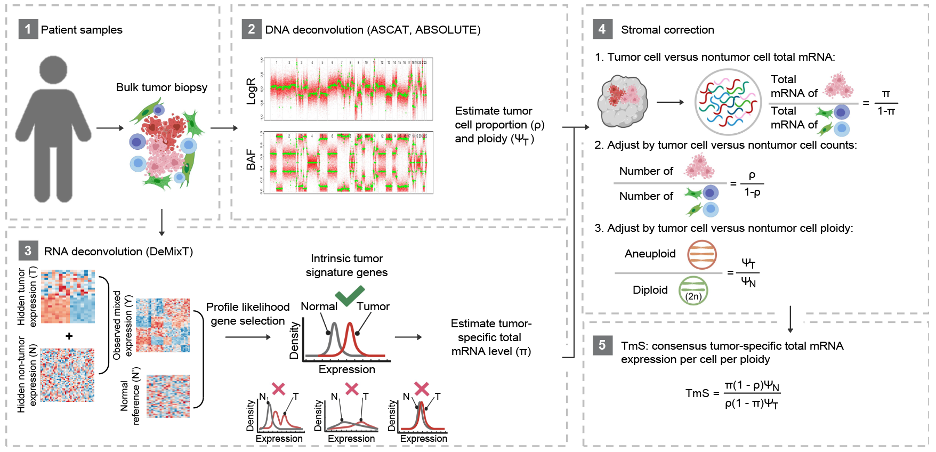 We sought to develop a strategy to overcome these challenges and estimate tumor-specific total mRNA expression in bulk patient samples. Building upon our prior work3,4, we found that using deconvolution methodology to partition tumor and non-tumor cells within the same sample under the same experimental conditions provides a mathematical means to cancel out confounding technical artefacts while maintaining the effect of cell-type-specific total transcript counts.