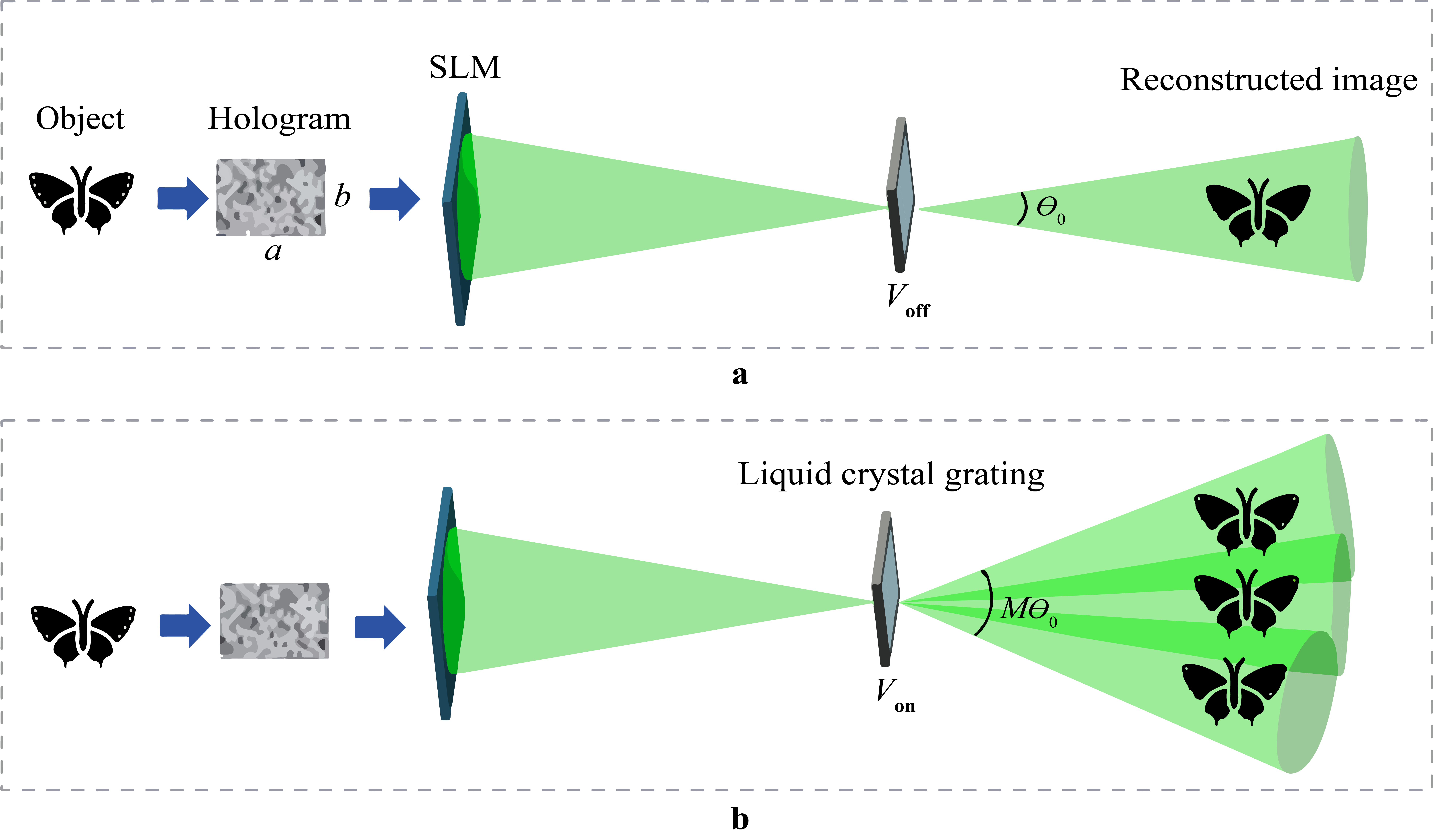 Figure 2 Principle of the wide viewing angle holographic 3D display. a Viewing angle of the holographic display in the initial state. b Viewing angle when the voltage is applied to the tunable liquid crystal grating.