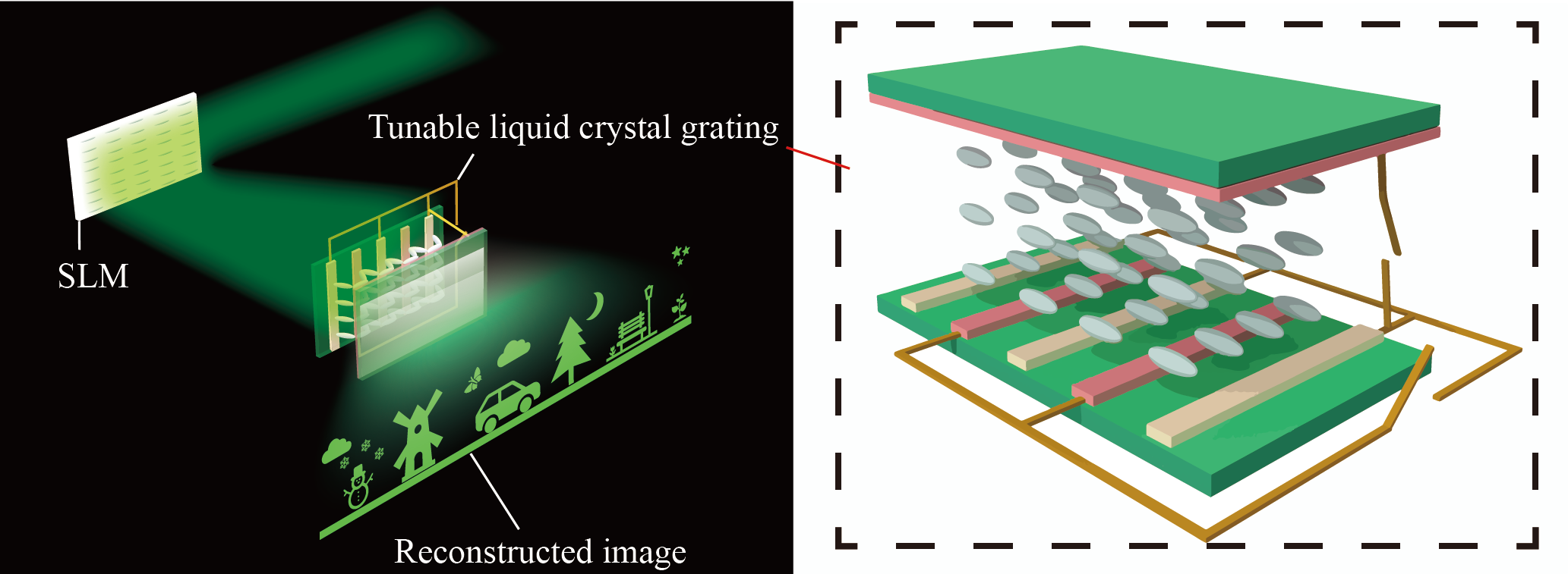 In this work, we introduce a tunable liquid crystal grating in the holographic 3D display system to overcome the limitations. The proposed system allows for wide viewing angle and large size, thus can enhance the viewing experience. As shown in Fig. 1, the tunable liquid crystal grating is placed behind an SLM to allow for the secondary diffraction of the reconstructed image. According to our design, the tunable liquid crystal grating can be controlled by the voltage to provide an adjustable period and flexible operations for the reconstructed light. The tunable liquid crystal grating comprises a top glass substrate, a top electrode, a liquid crystal layer, bottom electrodes, a bottom glass substrate and wires. A direct voltage VDC is applied to the top electrode and an alternating voltage VAC is applied to the bottom electrode. The voltage of the ground electrode is V0.