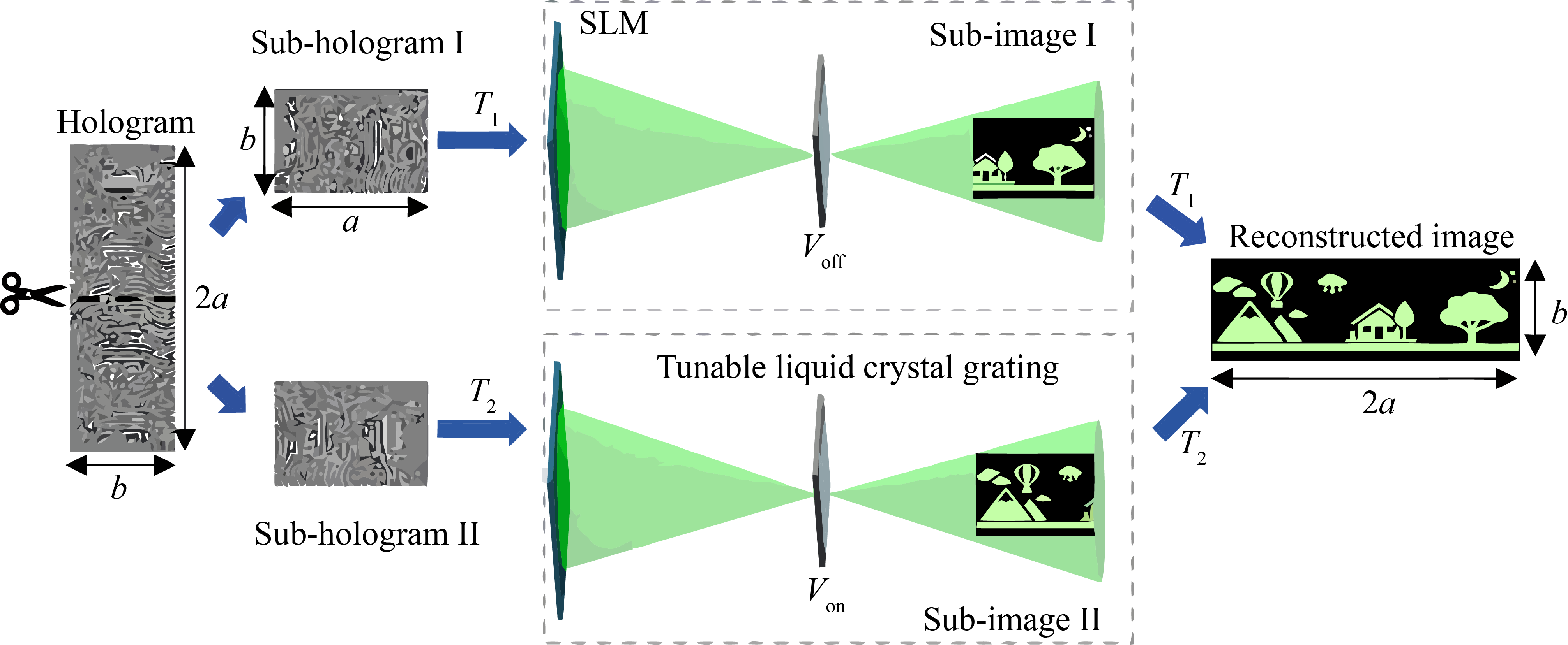 To realize wide viewing angle and large size display respectively, we apply different voltages to the tunable liquid crystal grating in cooperation with the corresponding hologram generation methods. In the wide viewing angle reproduction (Fig. 2), we adjust the voltage applied to the tunable liquid crystal and guarantee the liquid crystal molecules are arranged in the small periodic order. In this instance, the diffraction image is subjected to a secondary diffraction by the tunable liquid crystal grating and 7 secondary diffraction images can be generated. The proposed system achieves the viewing angle of 57.4°, which is 7 times that of the traditional system using a single SLM. It is worth noting that flexible viewing angle can be achieved by altering the parameters of the tunable liquid crystal grating. In the large size holographic reproduction (Fig. 3), we ensure that the tunable liquid crystal grating has different operations for the reconstructed image at different times by changing the applied voltages. At moment T1, we apply no voltage to the tunable liquid crystal grating, and it operates as a transparent glass. At moment T2, we apply suitable voltage to the liquid crystal grating to ensure that it diffracts the reconstructed image to the +1 order secondary maximum on the spectral plane. By taking advantage of the visual persistence effect of human eyes, we enlarge the reconstructed image seamlessly. The proposed system enlarges the size of the reconstructed image by 4.2 times. In both cases, the reconstructed images have sharp details and uniform intensity distribution.